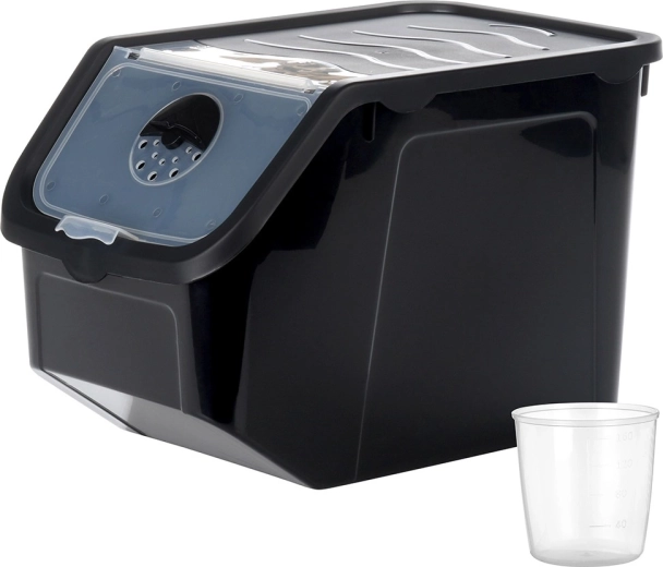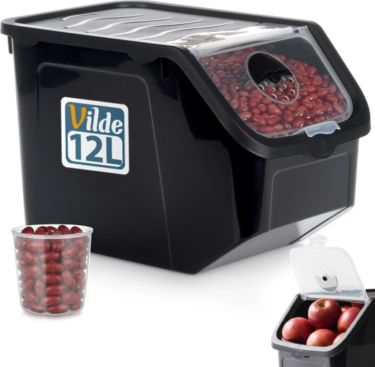Practical 12 L bin for vegetables and fruit measuring 34 × 23 × 23 cm. Features a snap-on transparent flap, adjustable ventilation for longer freshness, and is BPA-free. Suitable for food contact, freezer, and dishwasher, heat-resistant from -20 °C to 100 °C. Includes a measuring cup for accurate dosing.