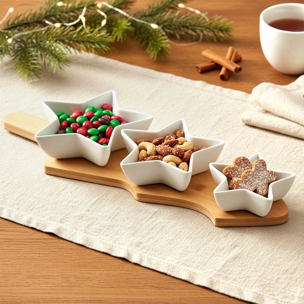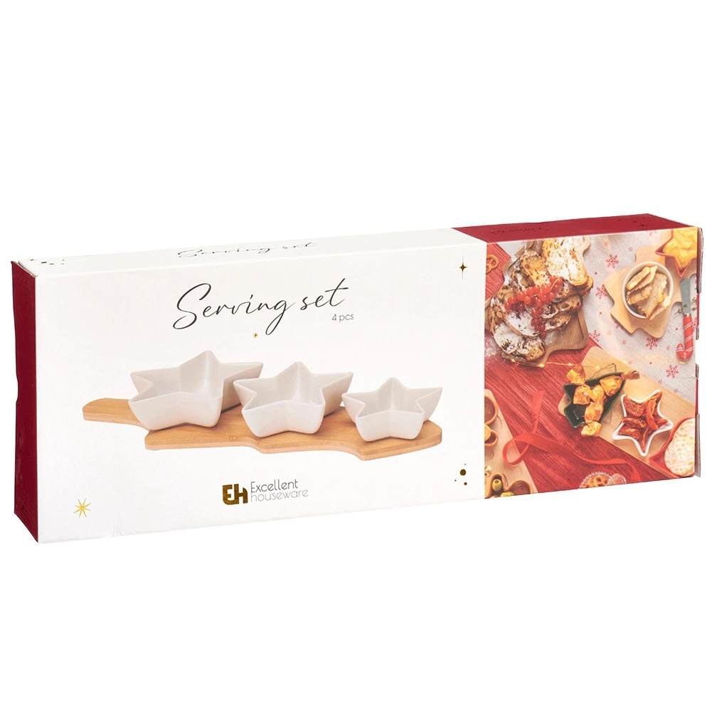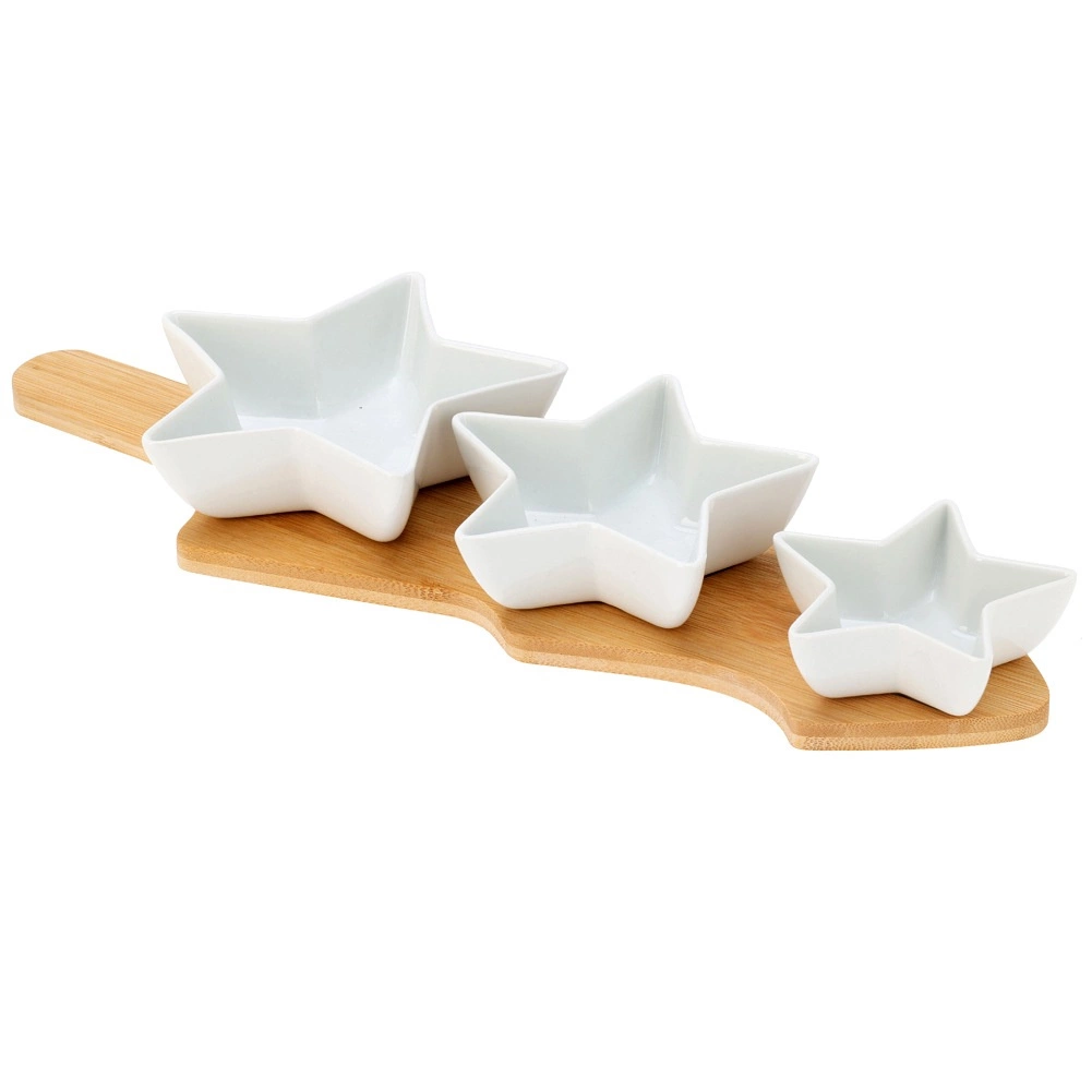 Stylish 4-piece serving set with star-shaped porcelain bowls and a tree-shaped bamboo tray. Ideal for elegant serving of nuts, olives, dips, and small treats. High-quality white porcelain and natural bamboo create a harmonious combination that will adorn any festive table.