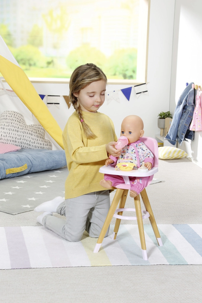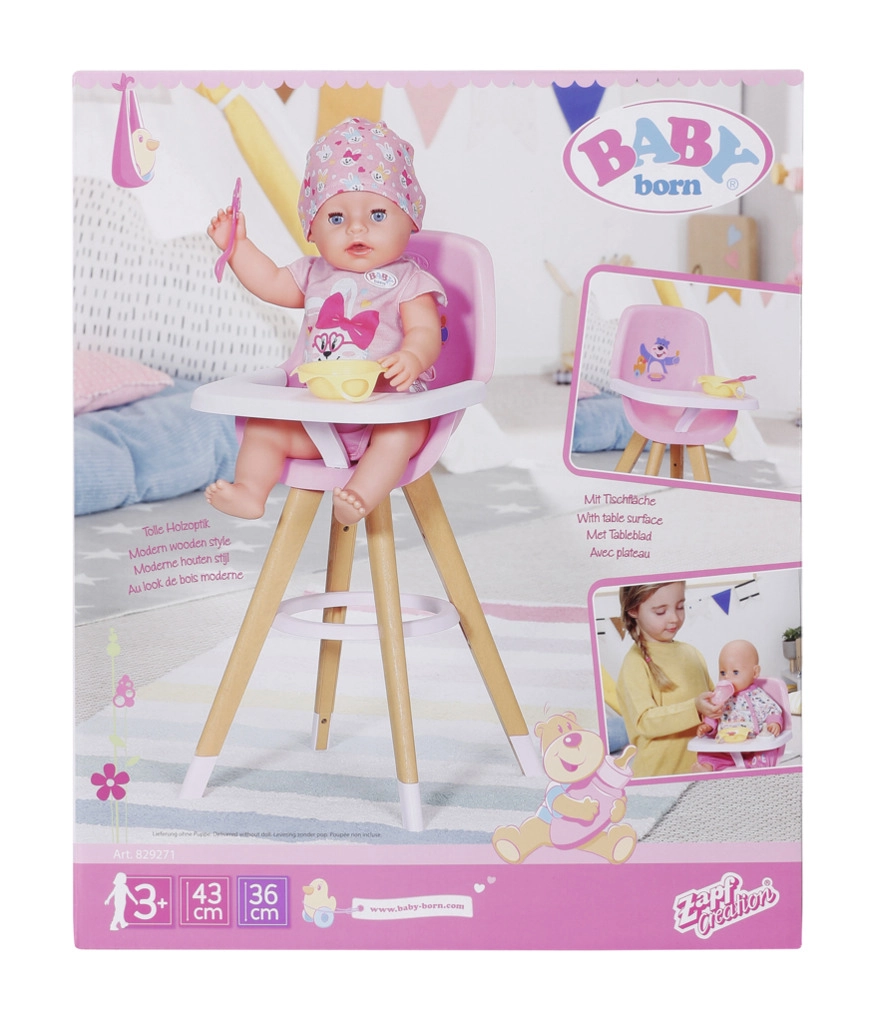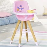 A stylish BABY born doll high chair in Scandinavian design brings kids creative feeding play. It features stable wood-look legs, a comfortable pink seat, and a removable tray with plenty of space for a plate, bottle, and other accessories. The cute bear and duck print delights little caregivers, and the chair also fits smaller dolls.