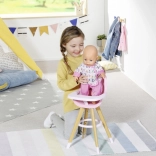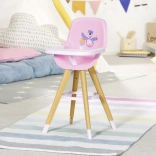 This modern BABY born doll high chair combines a Scandinavian look with functional design for everyday play. Stable, outward-angled legs with a wooden appearance and a circular footrest ensure confidence while serving treats. The pink seat with a high backrest and a cute print provides comfortable seating for the doll.