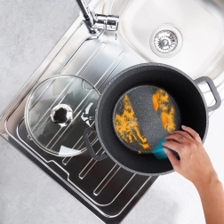 The pot is universal for all types of hobs (gas, electric, ceramic, halogen, induction) and is also oven-safe; the lid withstands temperatures up to 200 °C. Thanks to the non-stick surface, food doesn’t burn and cleaning is easy—the pot is dishwasher safe. The surface is free from PFOA and PTFE, so you cook healthily and with confidence.