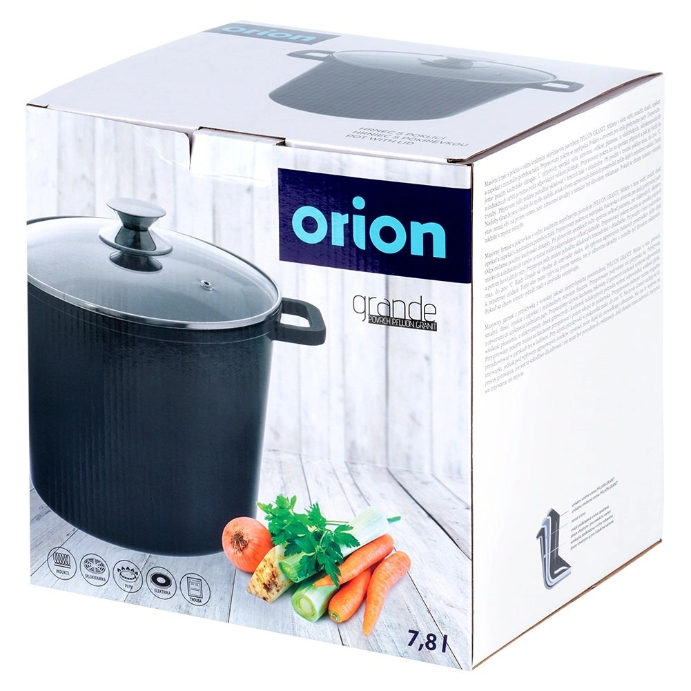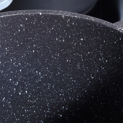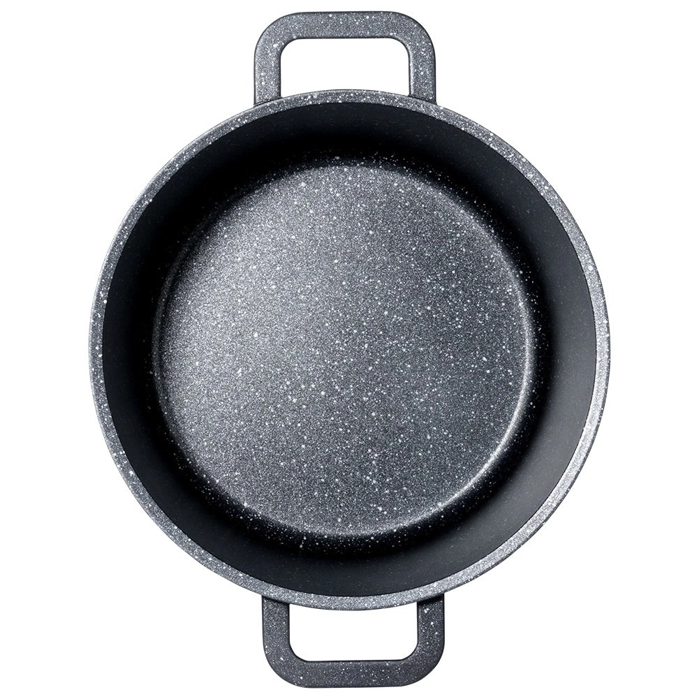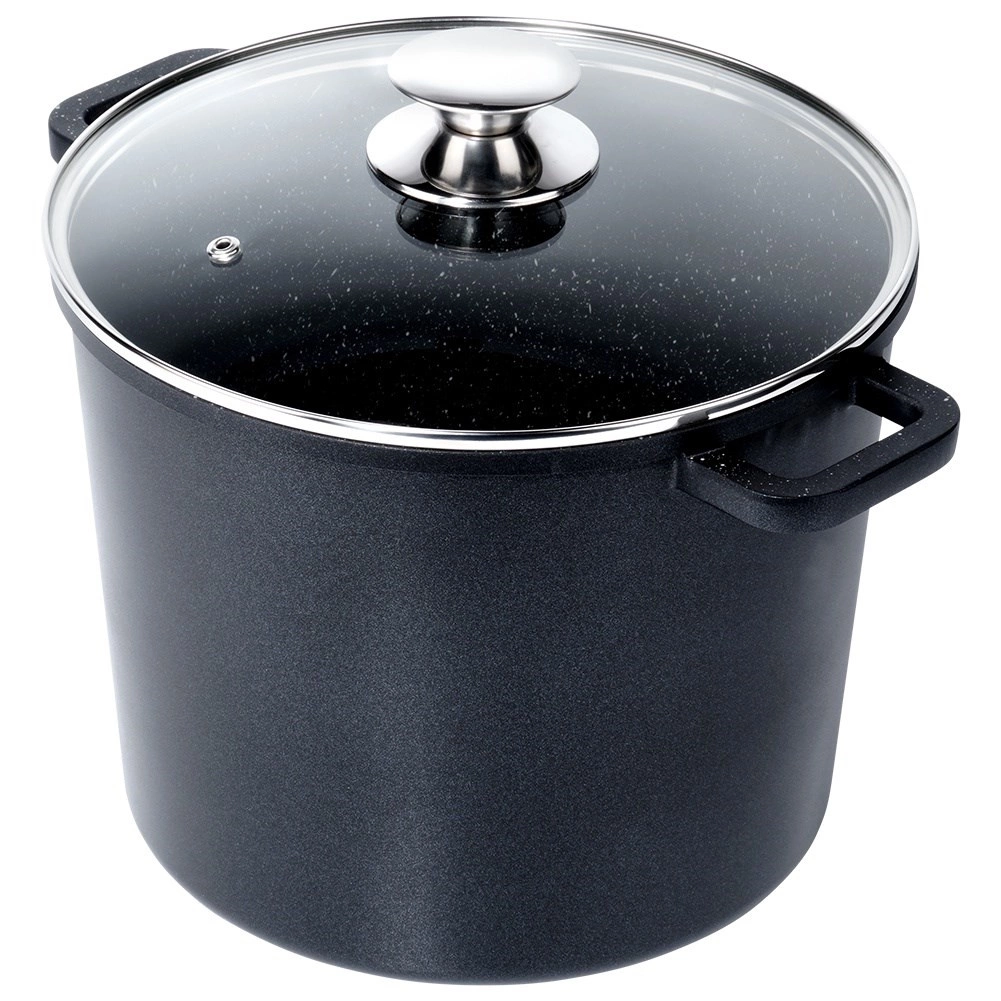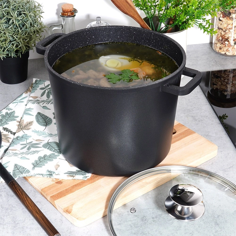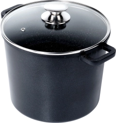 The robust tall GRANDE pot is made of durable aluminum with an internal non-stick granite PFLUON layer that resists scratches and high temperatures. Cooking is fast, even, and energy-efficient—ideal for stocks, sauces, and one-pot meals. The tempered glass lid with a stainless-steel rim and a steam-release vent lets you monitor cooking without unnecessary heat loss.