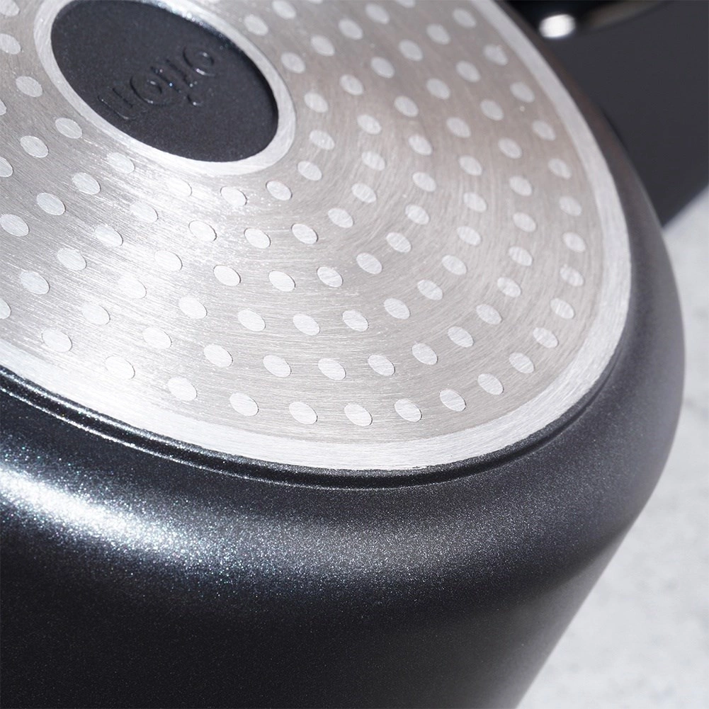 The heavy base ensures efficient heat distribution. Compatible with gas, electric, ceramic, halogen, and induction; also oven-safe.