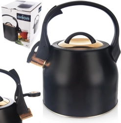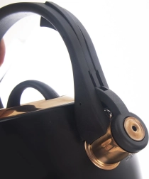 A stylish stainless-steel kettle in a combination of black and gold will be a highlight in both modern and classic kitchens. Thanks to its wide, stable base and quality material, it heats water quickly and efficiently without affecting its taste. The flip-up whistle reliably signals boiling, while the comfortable, heat-resistant handle ensures a safe grip.