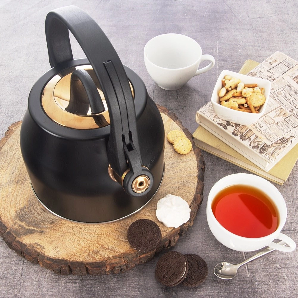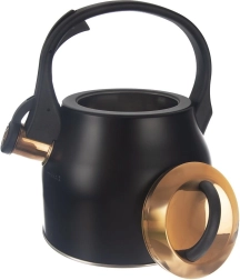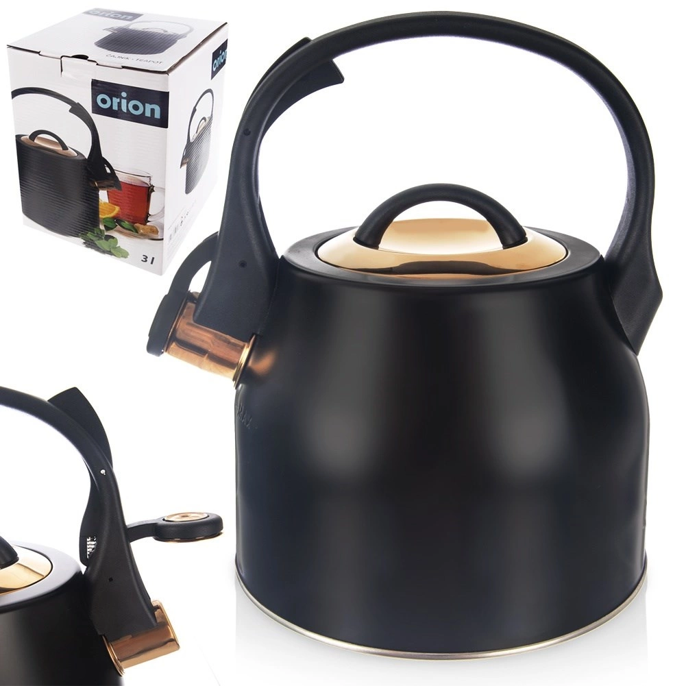 An elegant steel whistling kettle in matte black with gold accents combines style and functionality. It has a capacity of 3 l (usable 1.8 l), an ergonomic handle, a flip-up whistle, and an easy-to-remove lid. Suitable for all types of stoves including induction and perfect for everyday boiling of water for tea, coffee, and herbs.