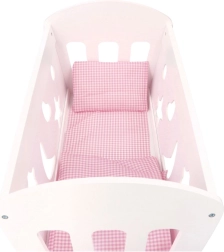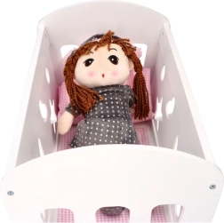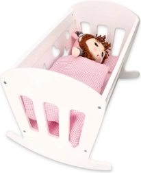 The cradle includes soft, pink checkered bedding, adding comfort and coziness for the doll.