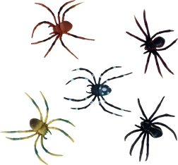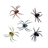 Enhance your decorations or educational activities with this set of five plastic spiders. Each spider is meticulously designed to imitate the real appearance of different species, ensuring a realistic and impressive look: