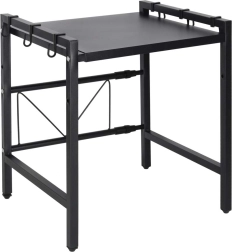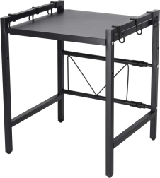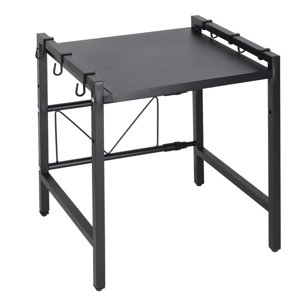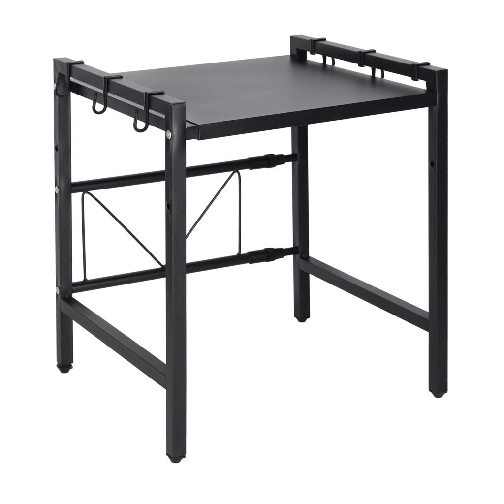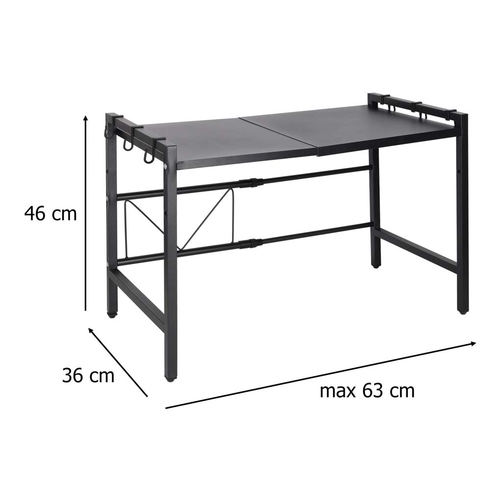 A practical, stable kitchen shelf over the microwave made from durable steel adds more counter space. It is extendable, has adjustable shelf height, and includes 6 hooks for accessories. The powder‑coated surface resists moisture and scratching, and the shelf holds up to 30 kg at the minimum width.