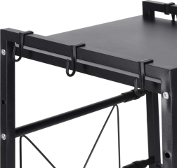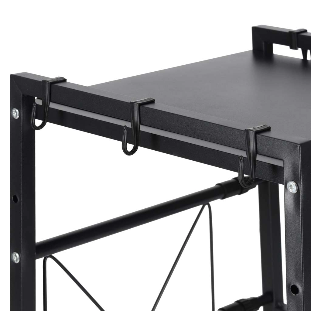 The package includes everything needed for quick assembly, including 6 hooks for towels or utensils and adjustable feet for stability. At the minimum width, the shelf supports a load capacity of up to 30 kg, providing reliable support for small appliances and heavier cookware.