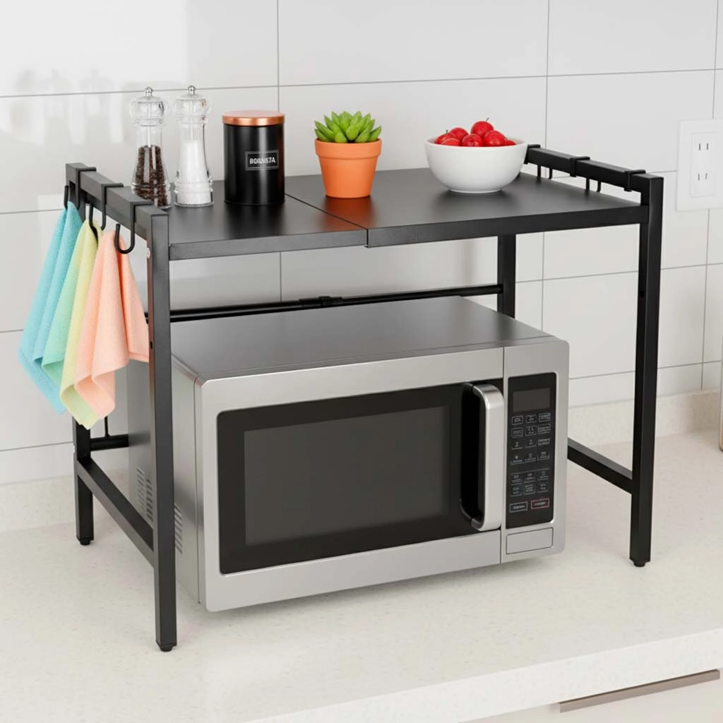 Adjustable kitchen shelf above microwave with hooks, metal