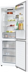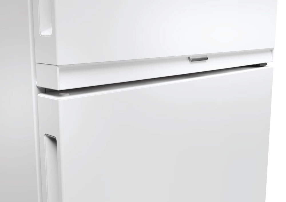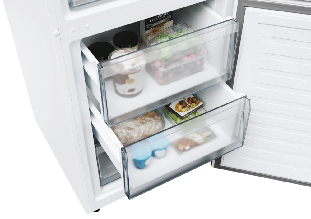 A practical fridge-freezer with the freezer at the bottom in elegant white, offering spacious layout, adjustable glass shelves, transparent drawers, and energy‑saving LED lighting for a perfect overview. Ideal for modern kitchens where you’ll appreciate convenient food organization and easy maintenance.