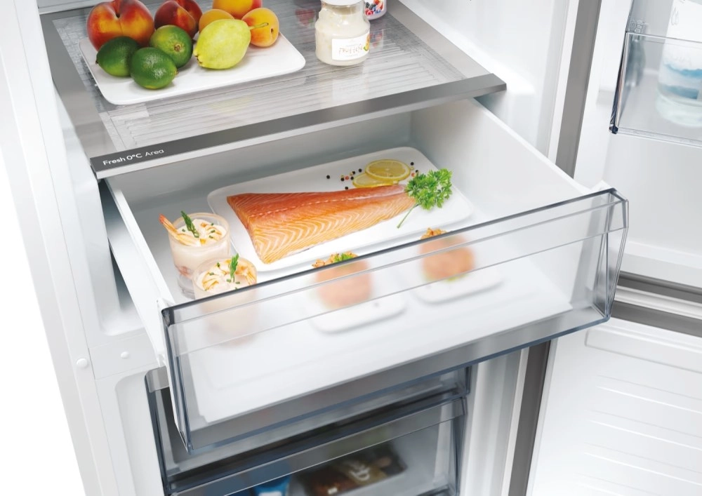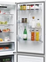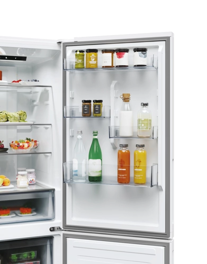 This freestanding refrigerator with a bottom freezer combines clean, minimalist design with a thoughtfully organized interior. Transparent boxes and adjustable shelves allow neat storage of drinks, fruit, vegetables, and ready meals, while bright LED lighting ensures perfect visibility in every corner.
