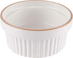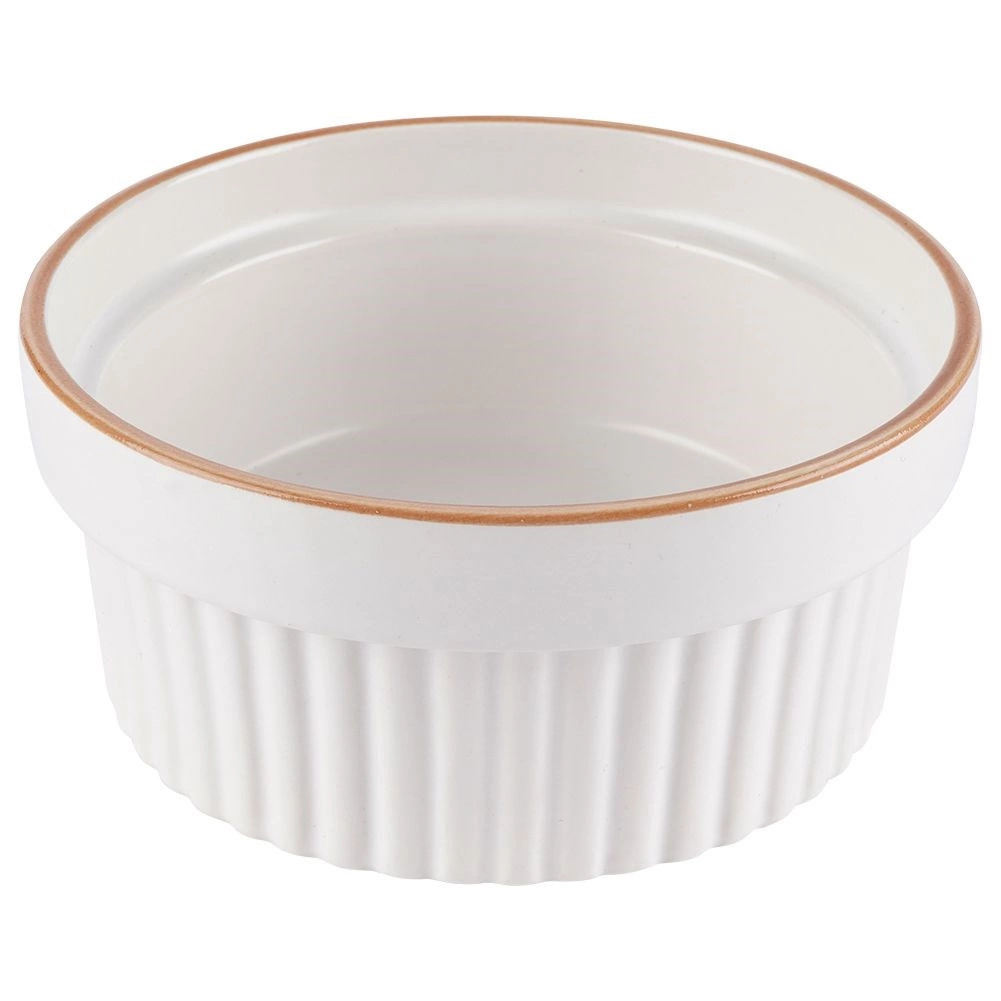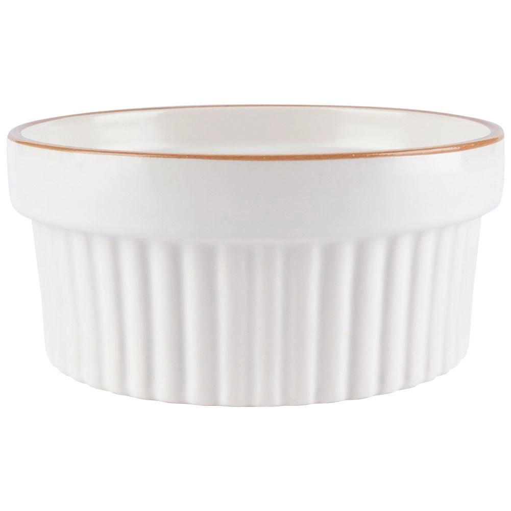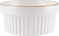 White porcelain ramekins with a delicate beige rim and vertical ribbing give your desserts and savory dishes a professional look.