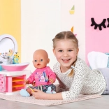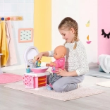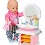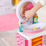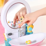 Teach children proper hygiene habits through play. The white-and-pink BABY born doll sink offers light and sound effects, a real water flow when pressing the tap, and cute accessories for complete care. When the mirror lights up, a melody plays that serves as a playful handwashing timer.