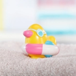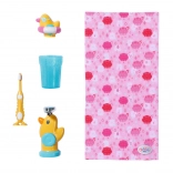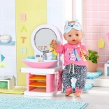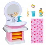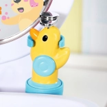 This fun BABY born doll sink turns daily hygiene into play. Press the button to light up the mirror and start melodies as a handwashing timer. A soap dispenser, running water when pressing the tap, and a duck-shaped drain plug make the play experience realistic. Includes a toothbrush, a cup with tooth-brushing sounds, and a towel.