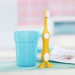 When you remove the blue cup, realistic tooth-brushing sounds play. Includes a toothbrush, soap dispenser, and towel.