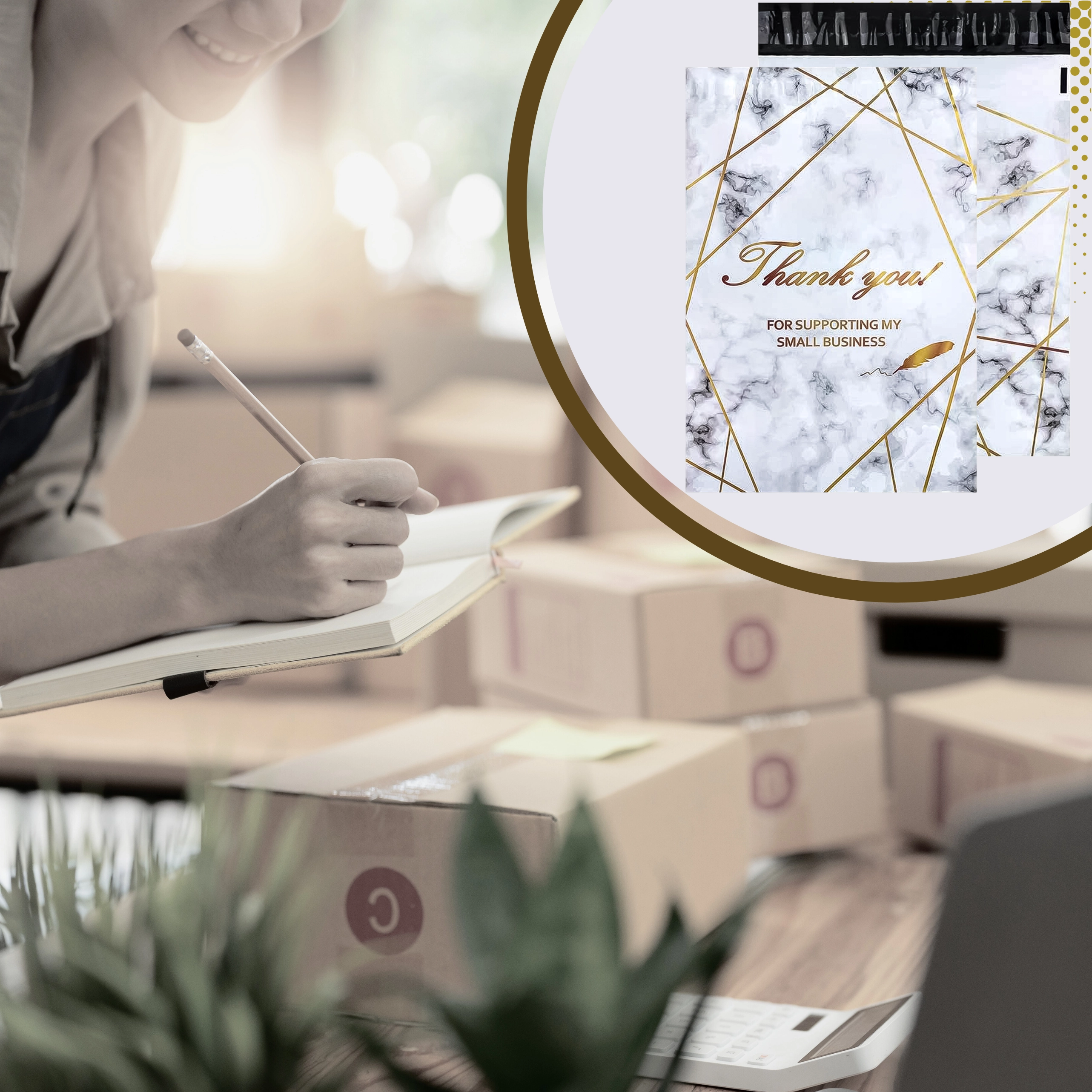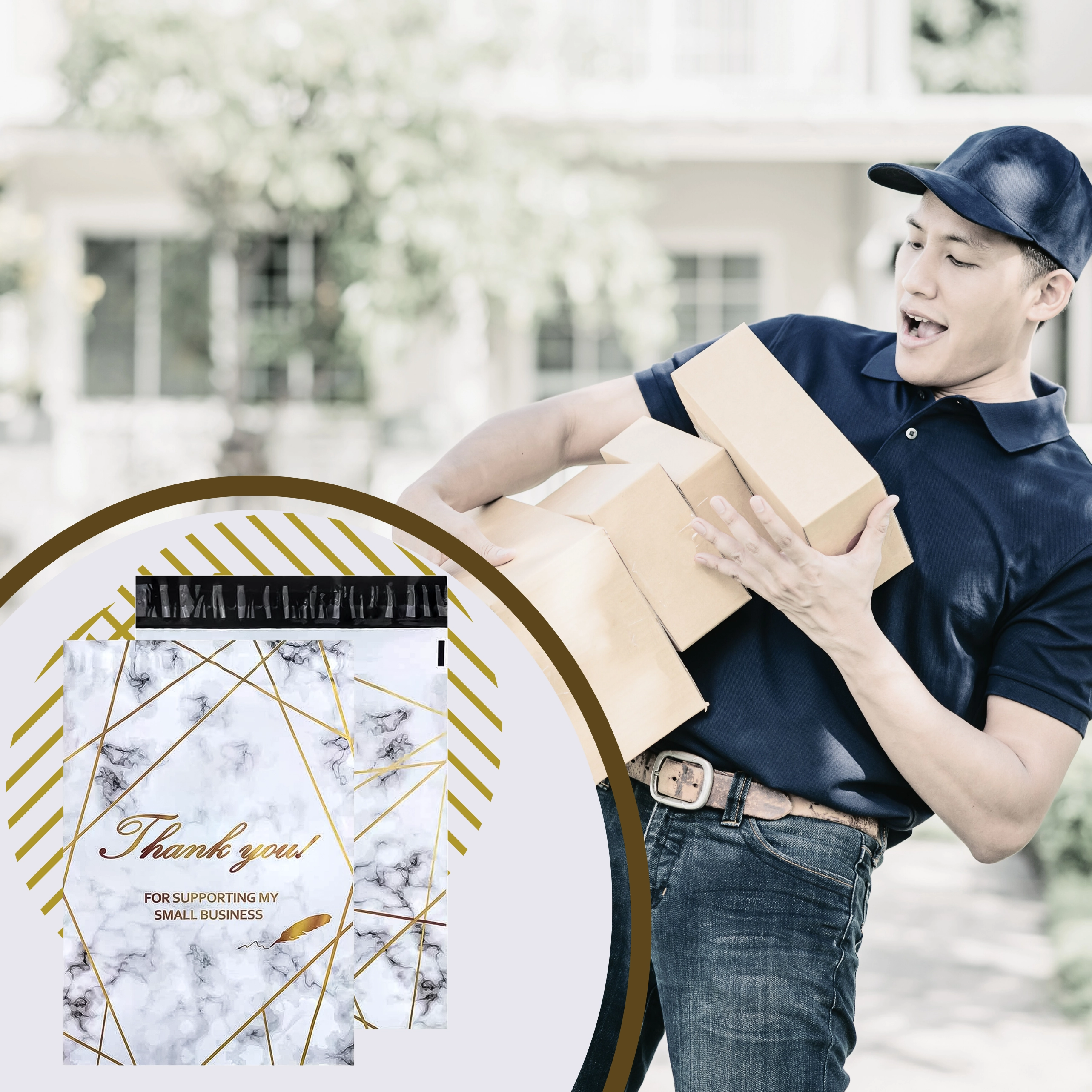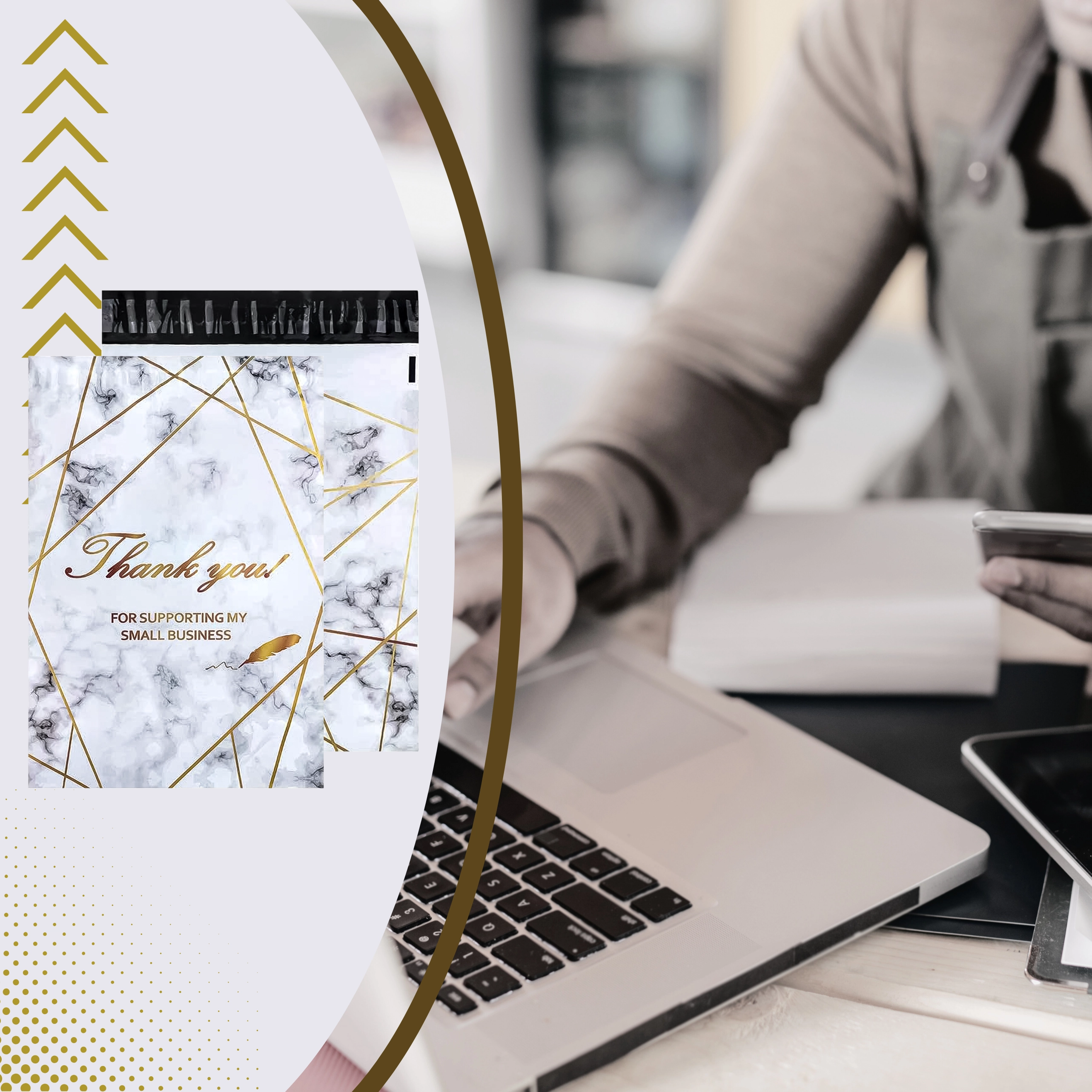 Looking for reliable packaging for your e-shop or regular shipments? These courier poly mailers combine strength, security, and aesthetics. The 380 × 520 mm size is ideal for small to medium products, textiles, or accessories. The gold marble design with the Thank You message gives your parcels a professional and friendly look.