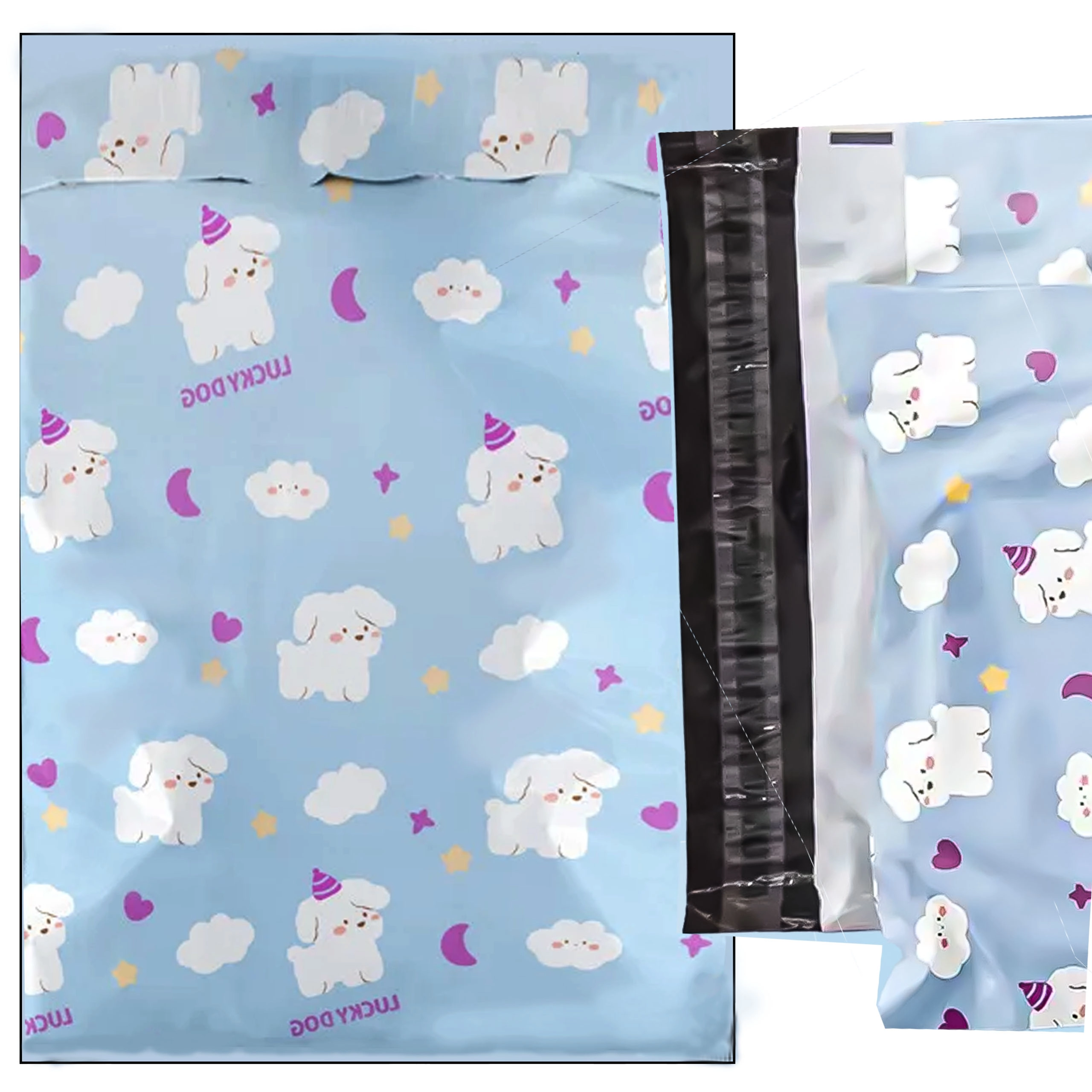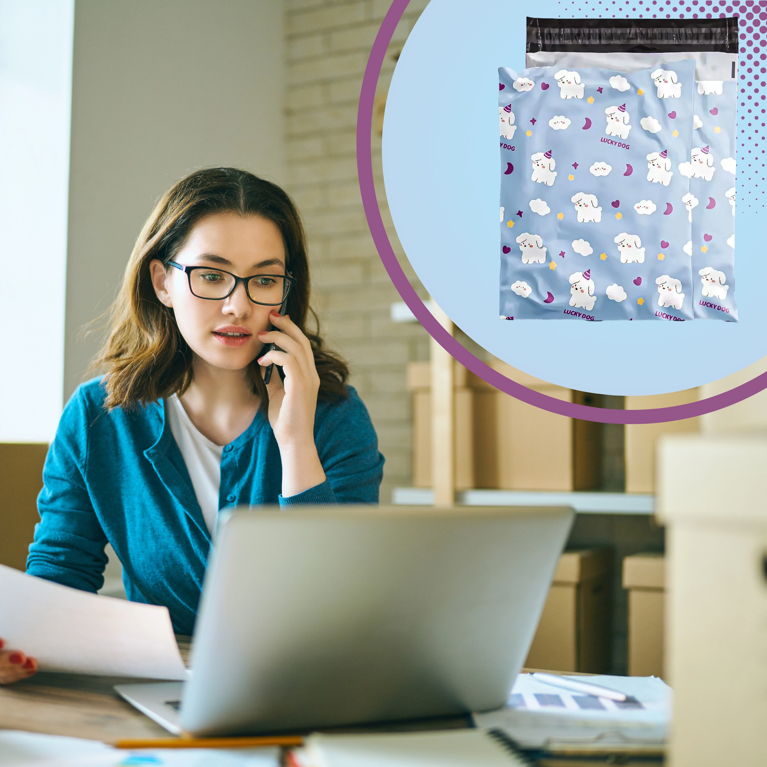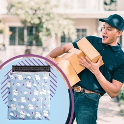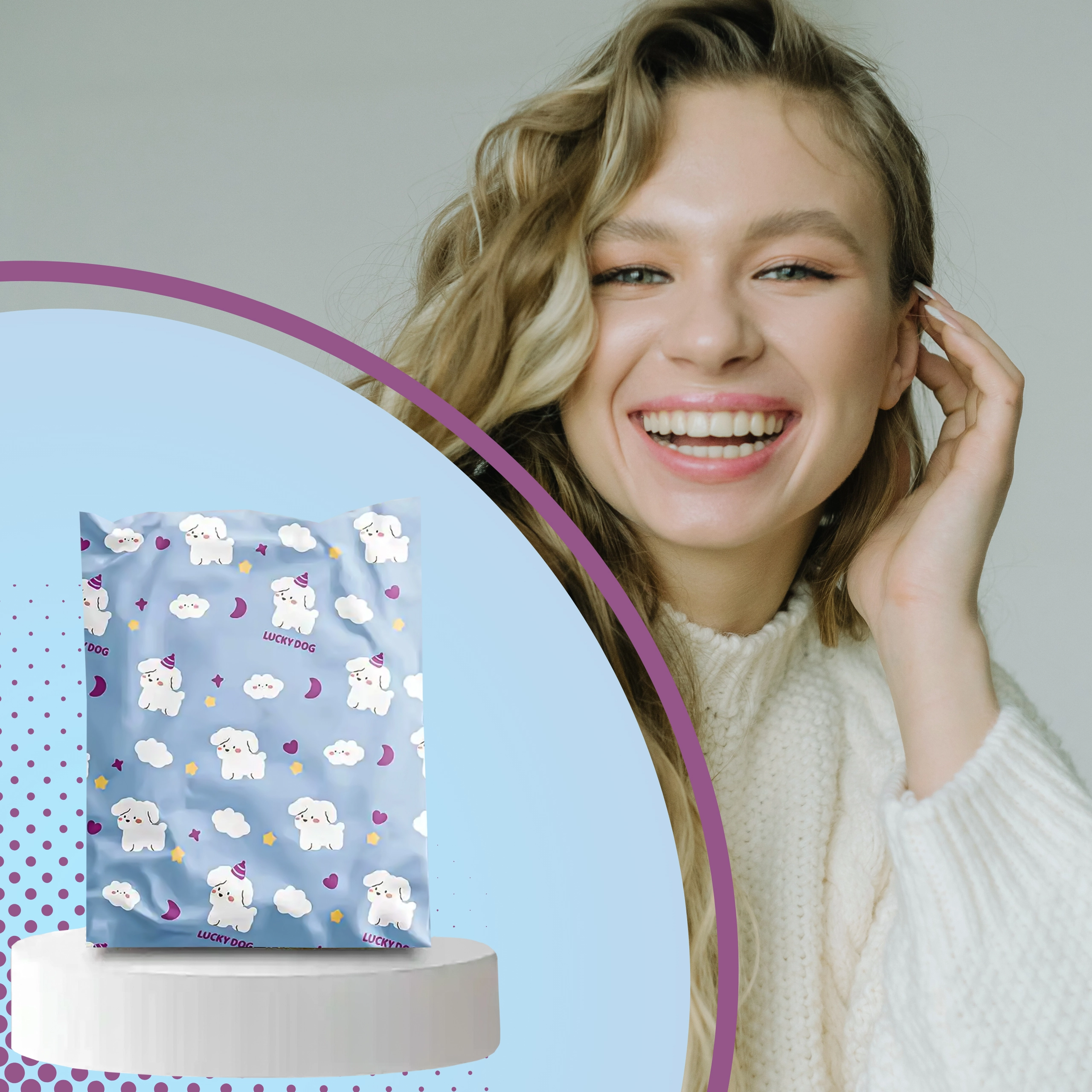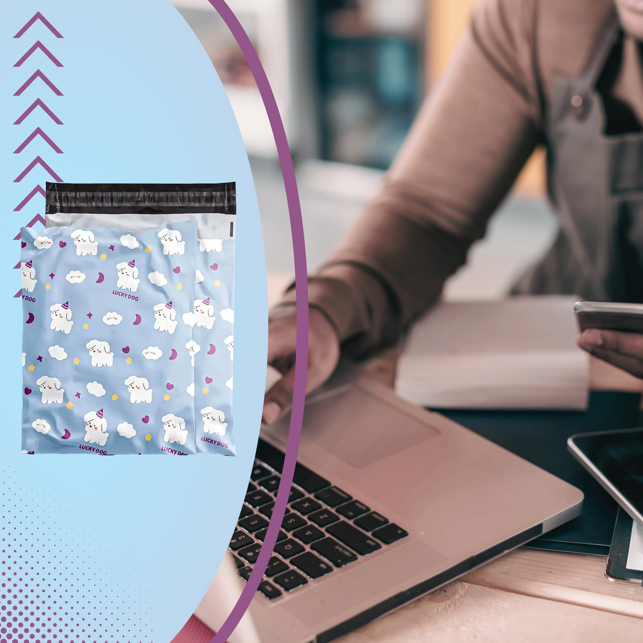 Stylish LUCKY DOG printed poly mailers combine attractive looks with high functionality. Thanks to the 310 × 420 mm size, you can safely pack hoodies, trousers, accessories, and other softer goods. The self-adhesive closure shortens packing time and ensures a reliable seal without extra tape.