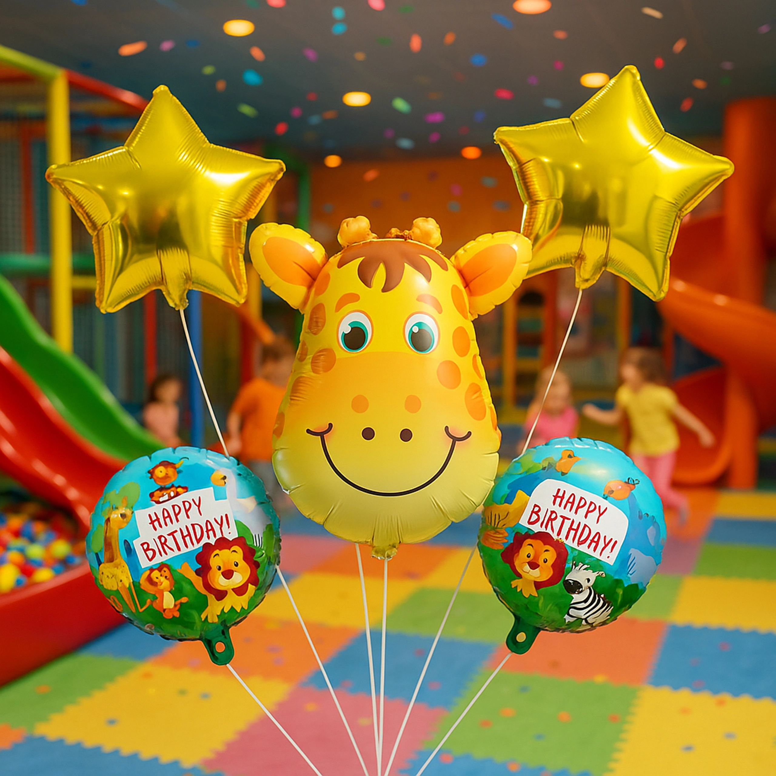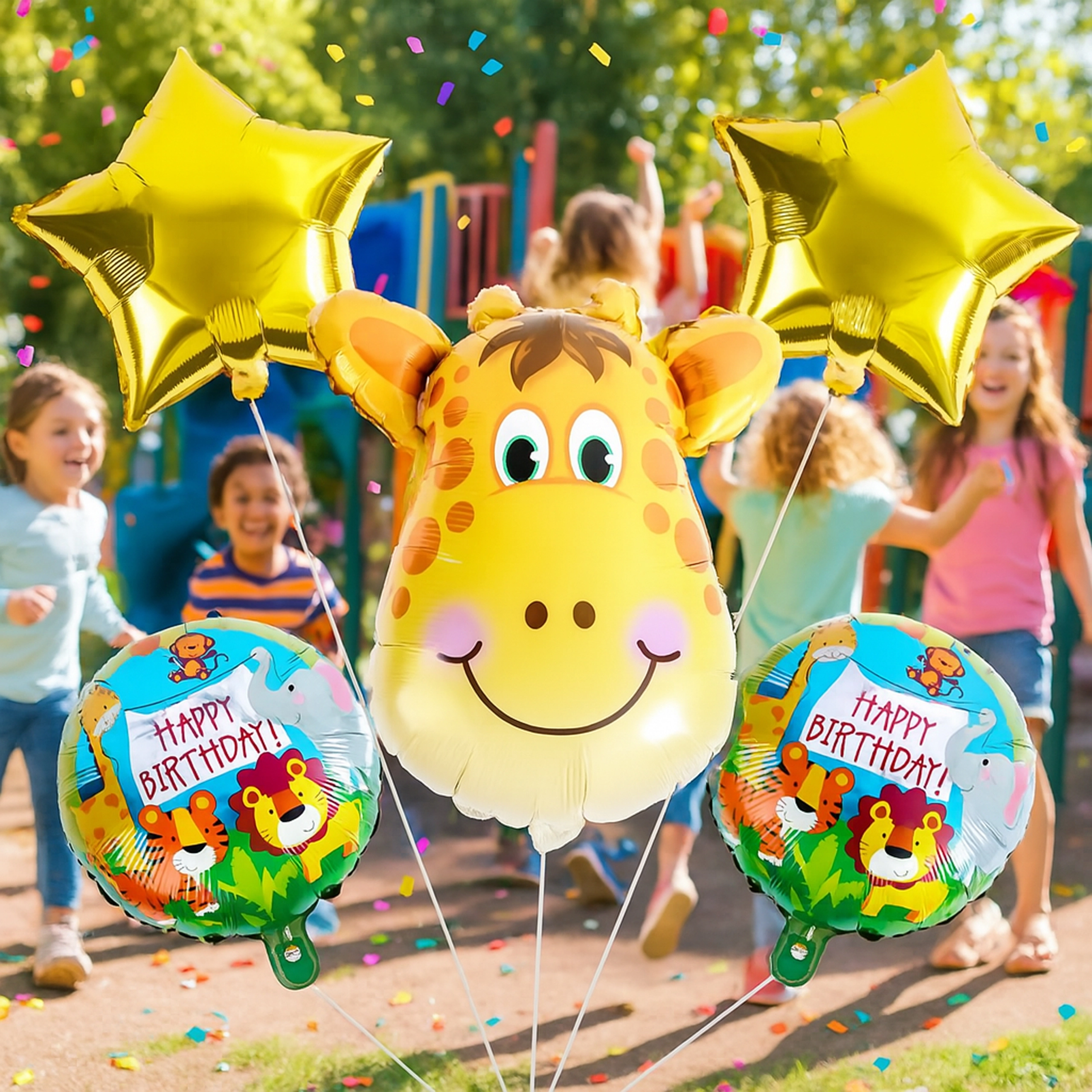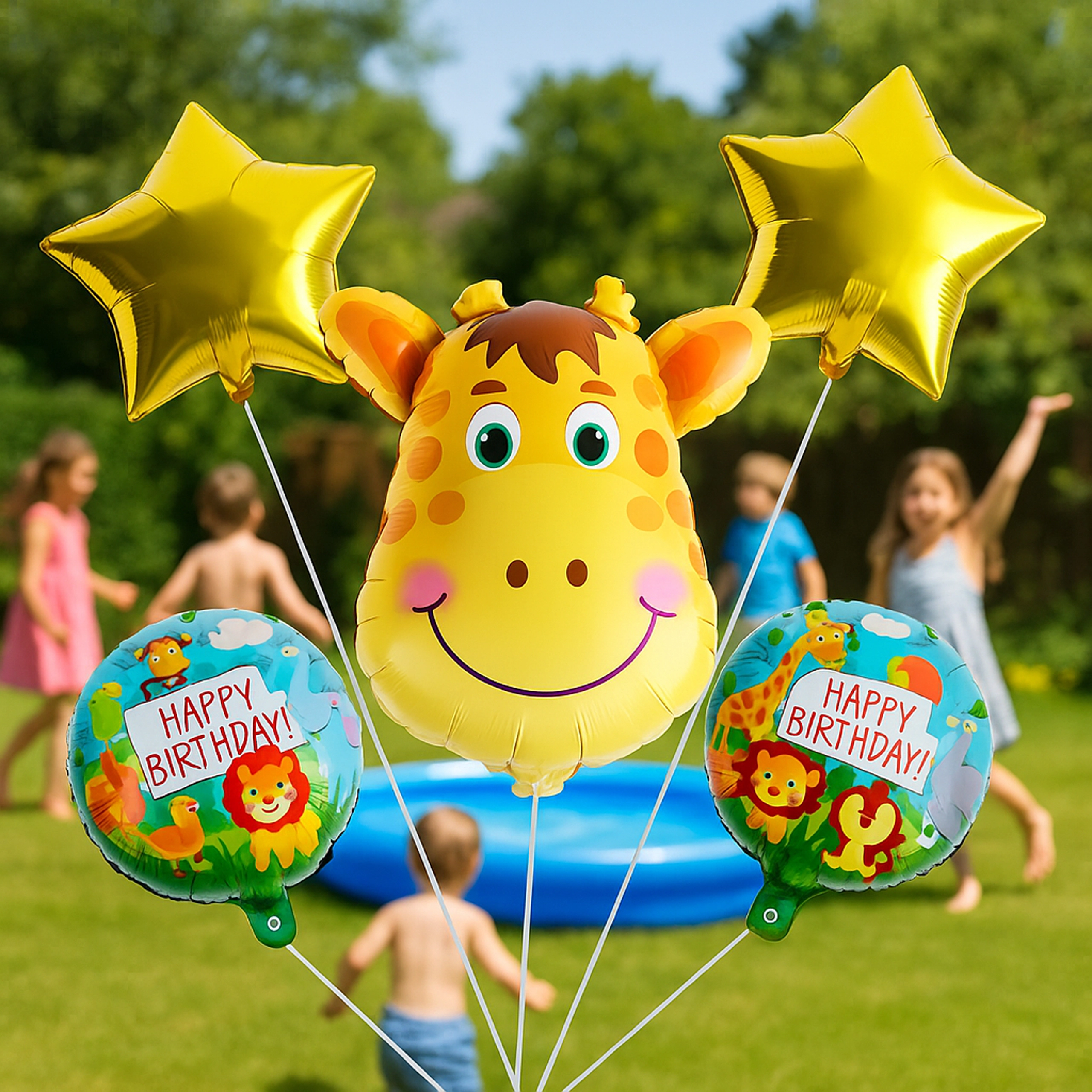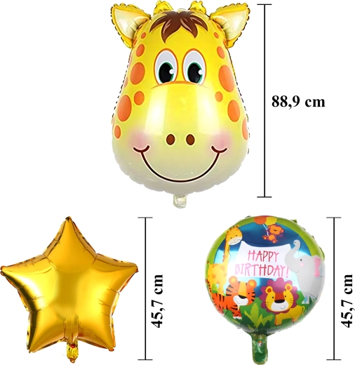 - 5 pcs (1× giraffe balloon, 2× HAPPY BIRTHDAY balloon, 2× gold star)