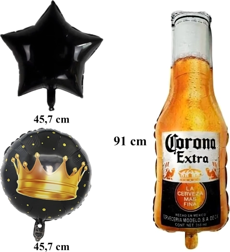 A stylish set of foil balloons with a Corona theme to brighten up any party. Includes a beer bottle–shaped balloon, 2 balloons with crown print, and 2 black stars. Perfect for birthdays, bachelor/bachelorette parties, and corporate events. Easy inflation with helium or air for instant impact without complicated prep.