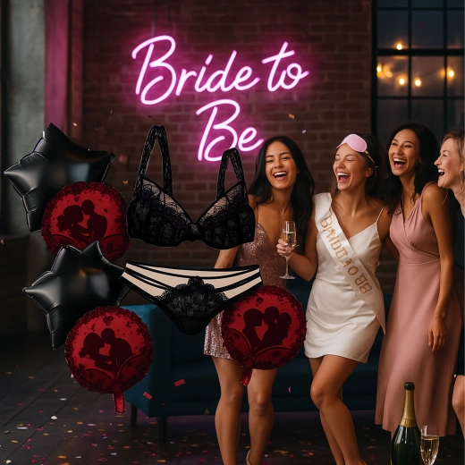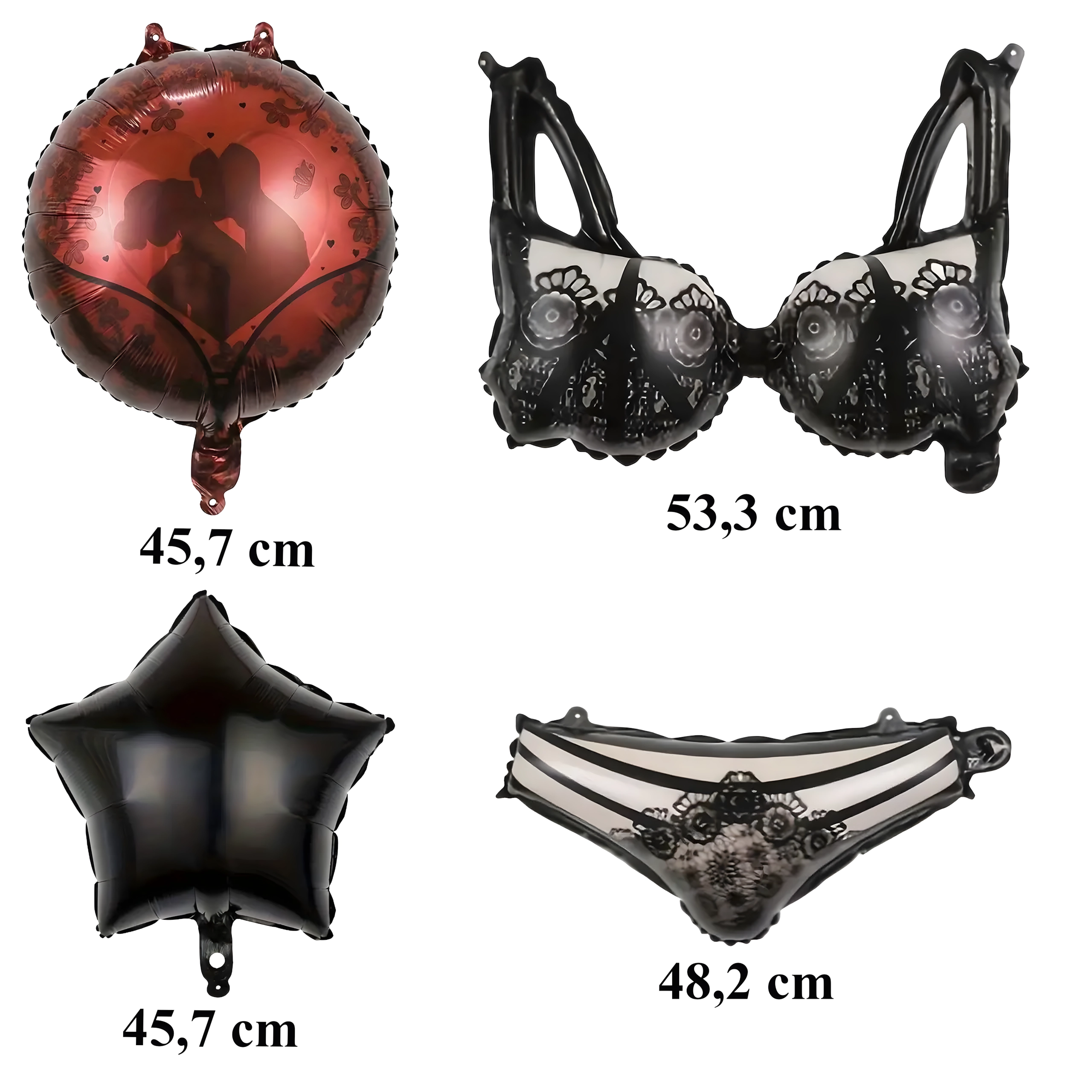 A fun hen party balloon set with a lingerie theme will light up any party. Includes a bra-shaped balloon (53.3 cm), panties-shaped balloon (48.2 cm), 2 round balloons and 2 printed balloons. Ideal as a photo booth decoration and for a Bride‑to‑Be party.