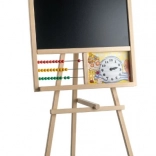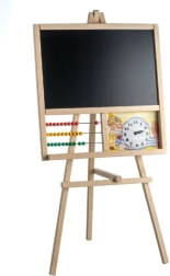 This wooden easel board is ideal for a young student's room. It is equipped with an abacus and cheerful hand clock, offering multiple options for fun learning experiences.