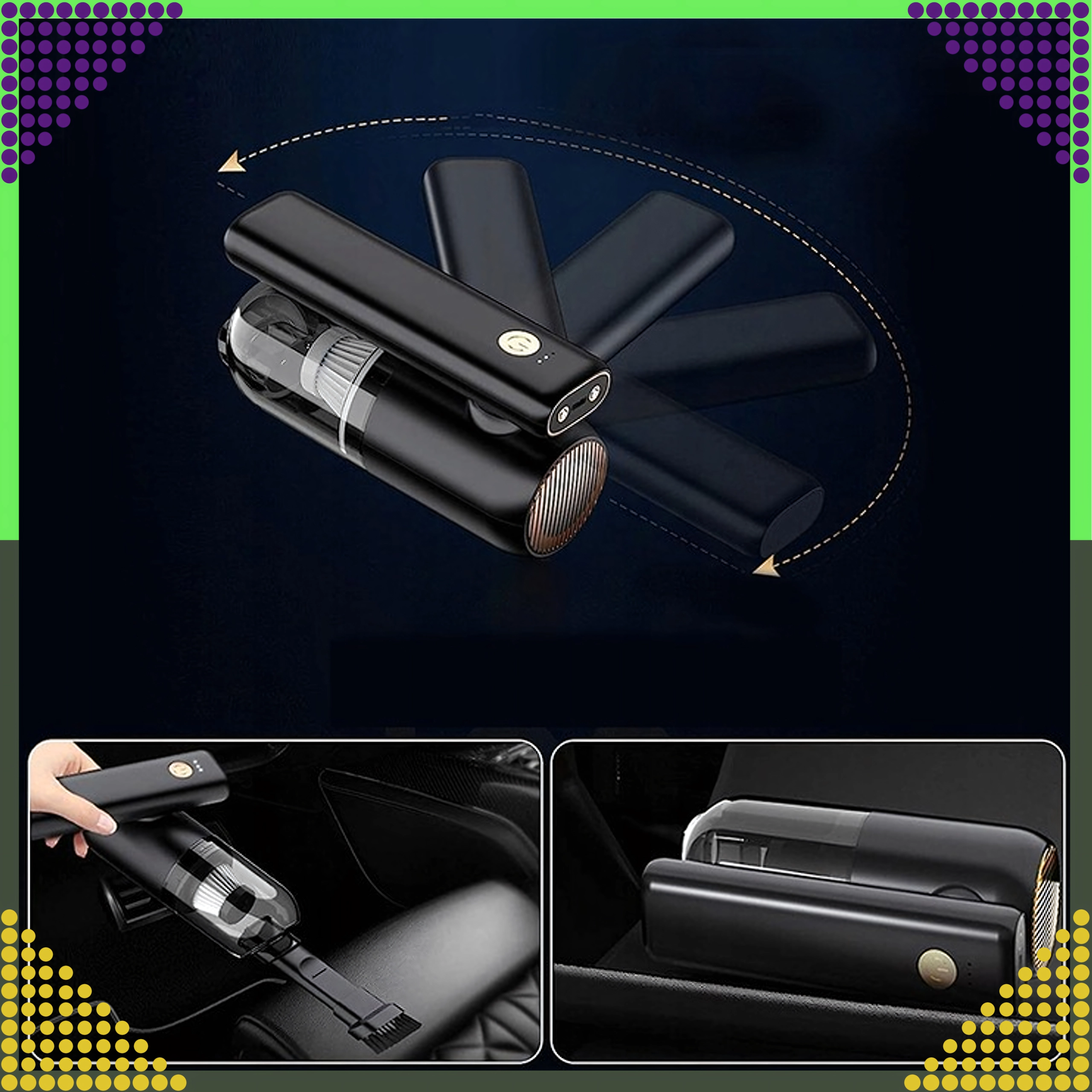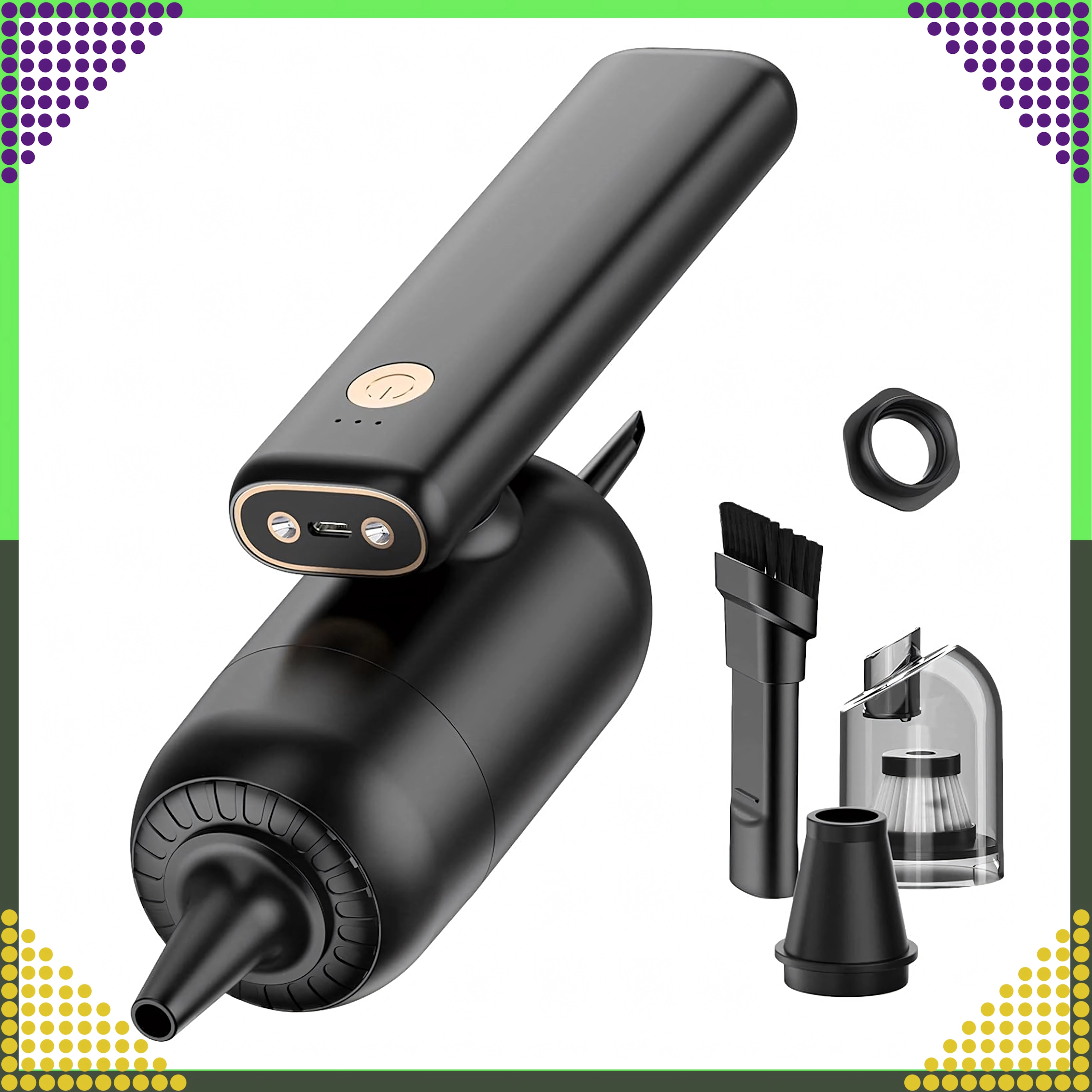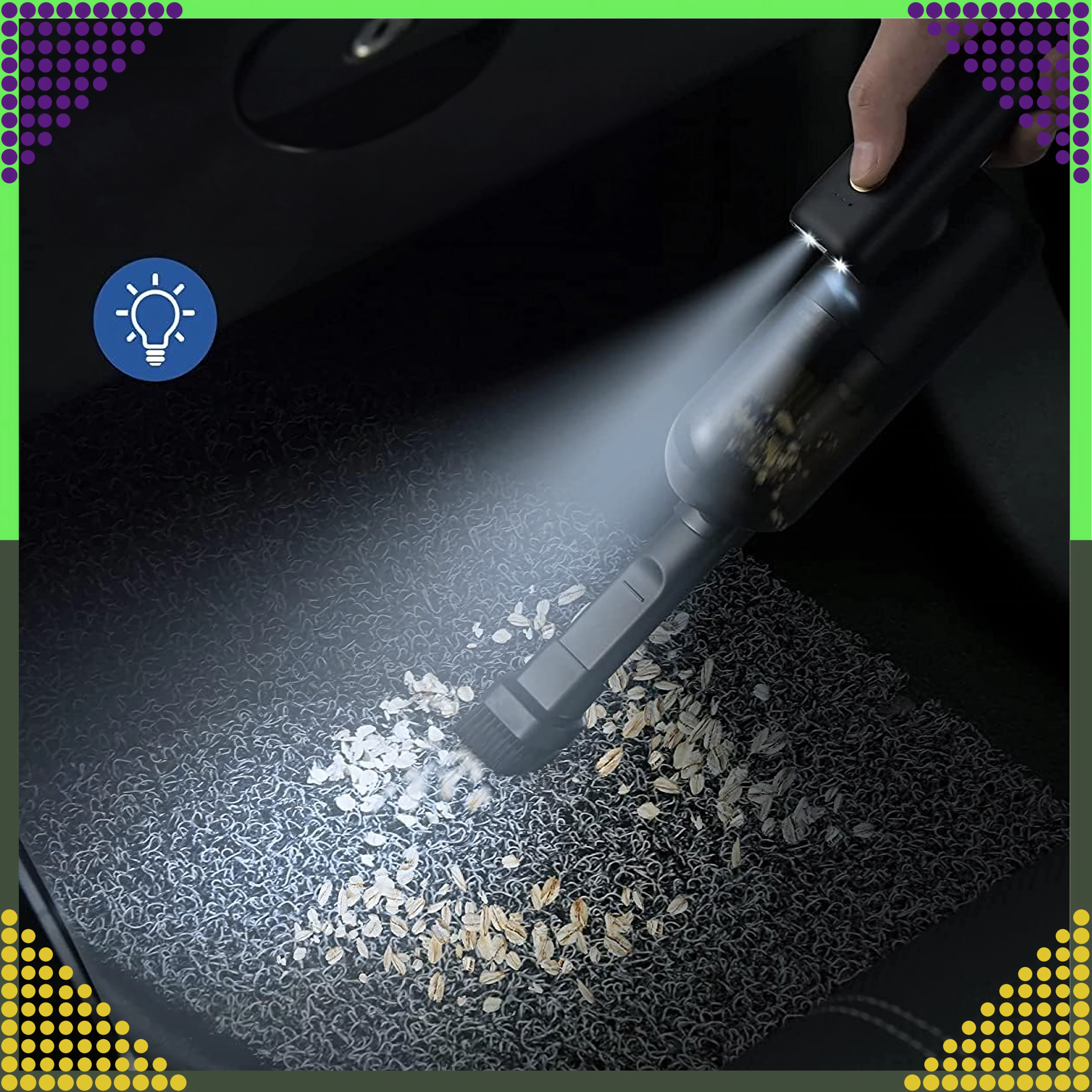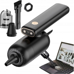 A compact and powerful 2‑in‑1 handheld vacuum for car and home that combines wireless operation, strong suction power, and a blow function in one device. Thanks to the HEPA filter, it effectively traps dust, pollen, and fine particles, while the LED lighting helps you see in dark areas. Ideal for quick cleanup of sand, dust, crumbs, and pet hair in the car, on the desk, or around the keyboard.