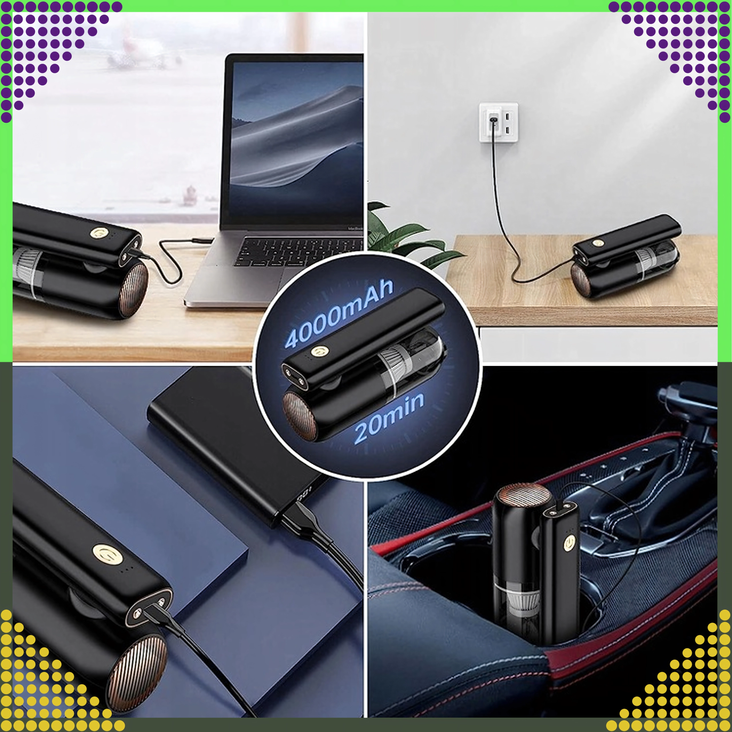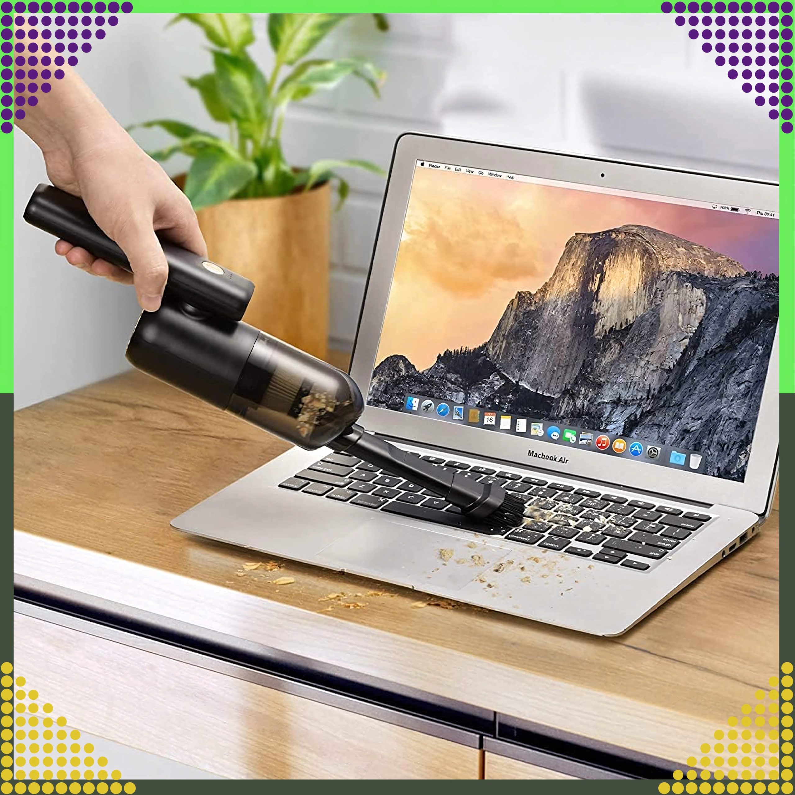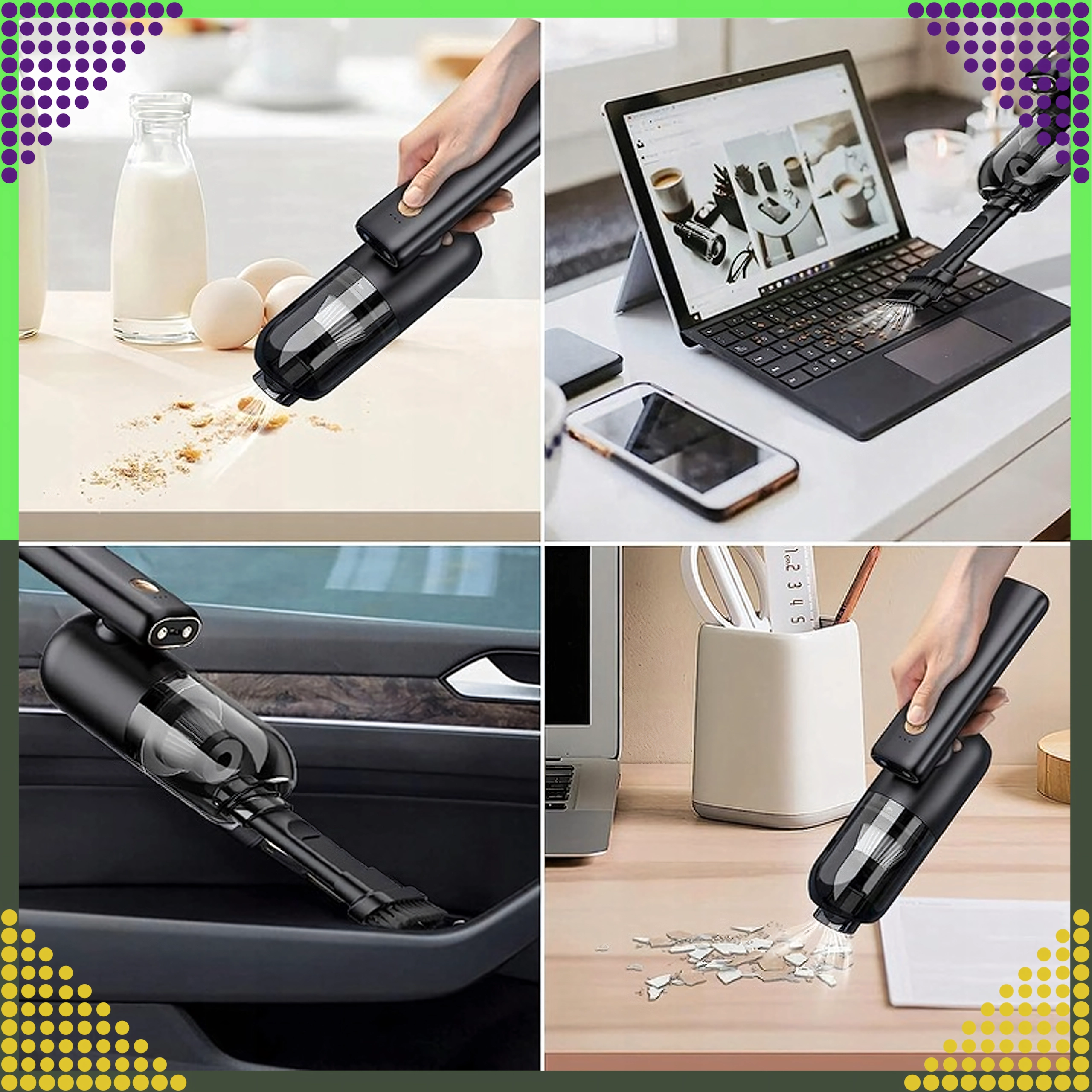 A compact and powerful 2‑in‑1 handheld vacuum for car and home that combines wireless operation, strong suction power, and a blow function in one device. Thanks to the HEPA filter, it effectively traps dust, pollen, and fine particles, while the LED lighting helps you see in dark areas. Ideal for quick cleanup of sand, dust, crumbs, and pet hair in the car, on the desk, or around the keyboard.