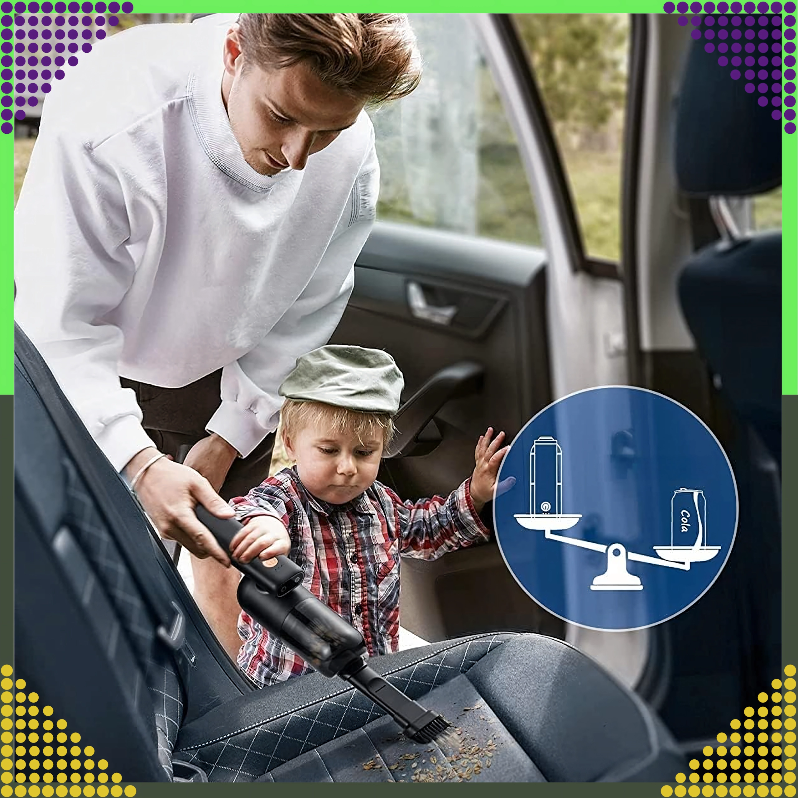 Lightweight, space‑saving, and cord‑free — take it anywhere. It fits easily in a door pocket or glove compartment and is always at hand for a quick interior cleanup.