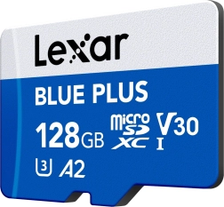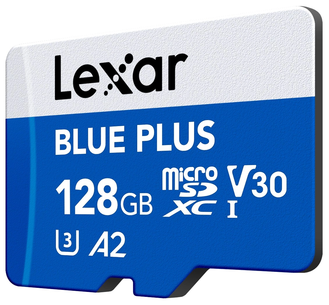 Expand storage and speed up your workflow with the LEXAR Blue Plus 128 GB microSD card. It offers read speeds up to 170 MB/s, UHS‑I U3 / V30 class for smooth 4K UHD video, and A2 performance for snappy app launches. It is resistant to water, temperatures, and X‑rays and ideal for phones, action cameras, drones, and consoles.