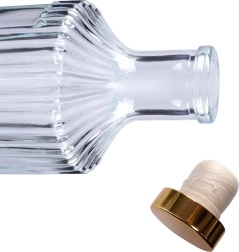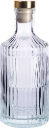 A stylish clear glass bottle with a modern ribbed design and a decorative gold cork, suitable for serving and storing beverages. Its compact size makes it easy to handle and store in the fridge or on a shelf. The bottle is easy to clean and suitable for everyday use at home and in hospitality.