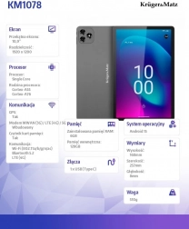 The modern KRÜGER&MATZ Eagle 1078S tablet features a 11" IPS display with 1920 × 1200 resolution, 90 Hz smoothness, a powerful 8-core MediaTek processor, and 8 GB RAM for fast work and entertainment. With 256 GB storage (expandable via microSD), LTE, Wi‑Fi ac, Bluetooth 5.2, and a 7000 mAh battery, it’s ready for all-day use, video calls, and multimedia.