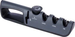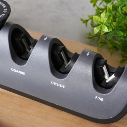 The four sharpening zones let you work step by step: Coarse to restore very dull edges, Crude for standard sharpening, Fine (ceramic) for delicate honing and final polishing, plus a dedicated diamond zone for scissors. Its compact size makes it easy to store in a kitchen drawer, yet the tool is durable and lightweight for everyday use.