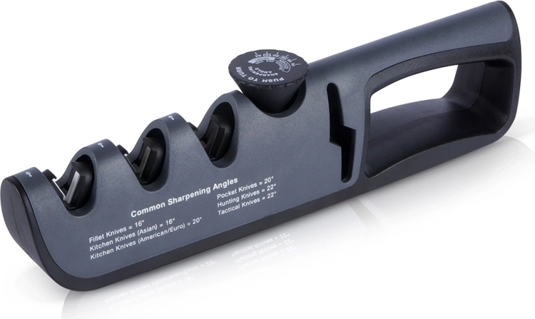 The dial lets you set the ideal angle for kitchen knives (14–20°), EDC and folders (20–22°), or more robust outdoor and hunting blades (22–24°).