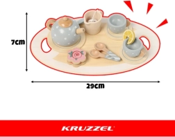 The adorable wooden Kruzzel tea set in grey brings children hours of imaginative play. It includes a teapot, milk jug, cups with saucers, spoons, cookies, a lemon slice, a tea bag, and a serving tray. Safe craftsmanship, durable wood, and realistic accessories support the development of motor skills, social skills, and learning through play.