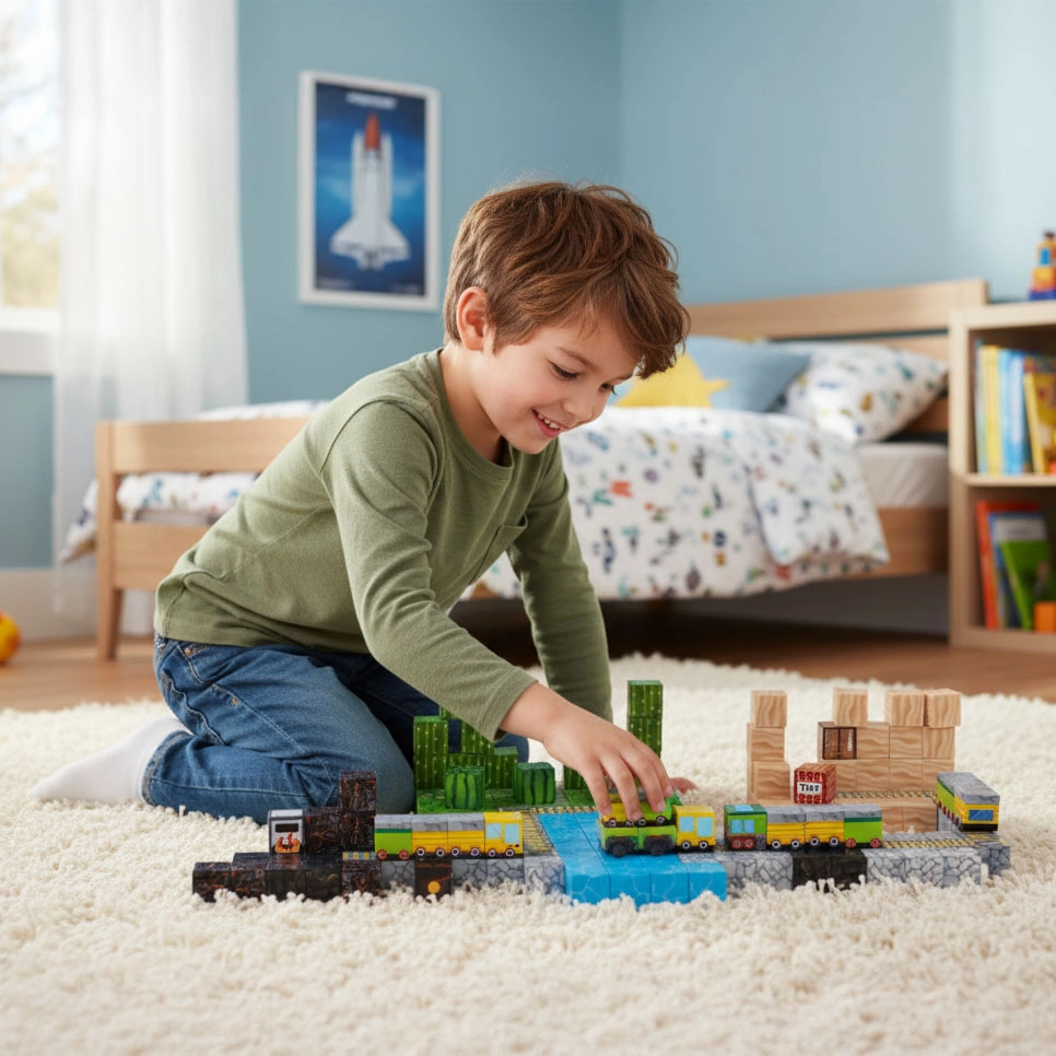 Magnetic blocks with colorful prints naturally snap together thanks to integrated magnets. Children quickly achieve visible results, boosting their confidence and eagerness to keep creating. The set is ideal for play at home, in kindergarten, or on the go.