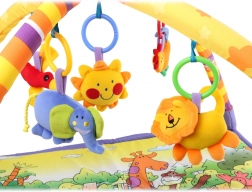The toys rattle and squeak, supporting the development of hearing, touch, and both fine and gross motor skills. Thanks to openable rings, you can detach them easily and your child can take favorite buddies along. The mat is compact, quick to set up and fold down, and with the portable plastic bag you can take it anywhere.