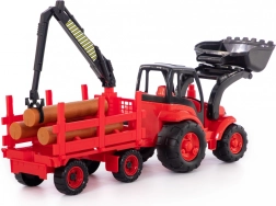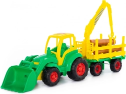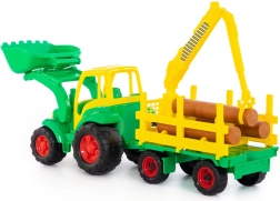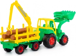 This colorful tractor with large wheels and a log trailer is perfect for creative play at home and on the playground. Children can use the movable front bucket to scoop materials and the crane with grab on the trailer to lift and load wooden logs. The durable plastic design ensures long life and safe play.