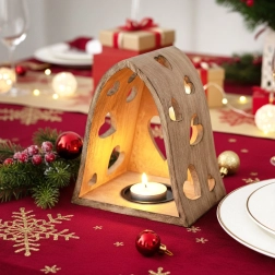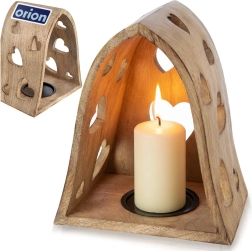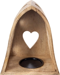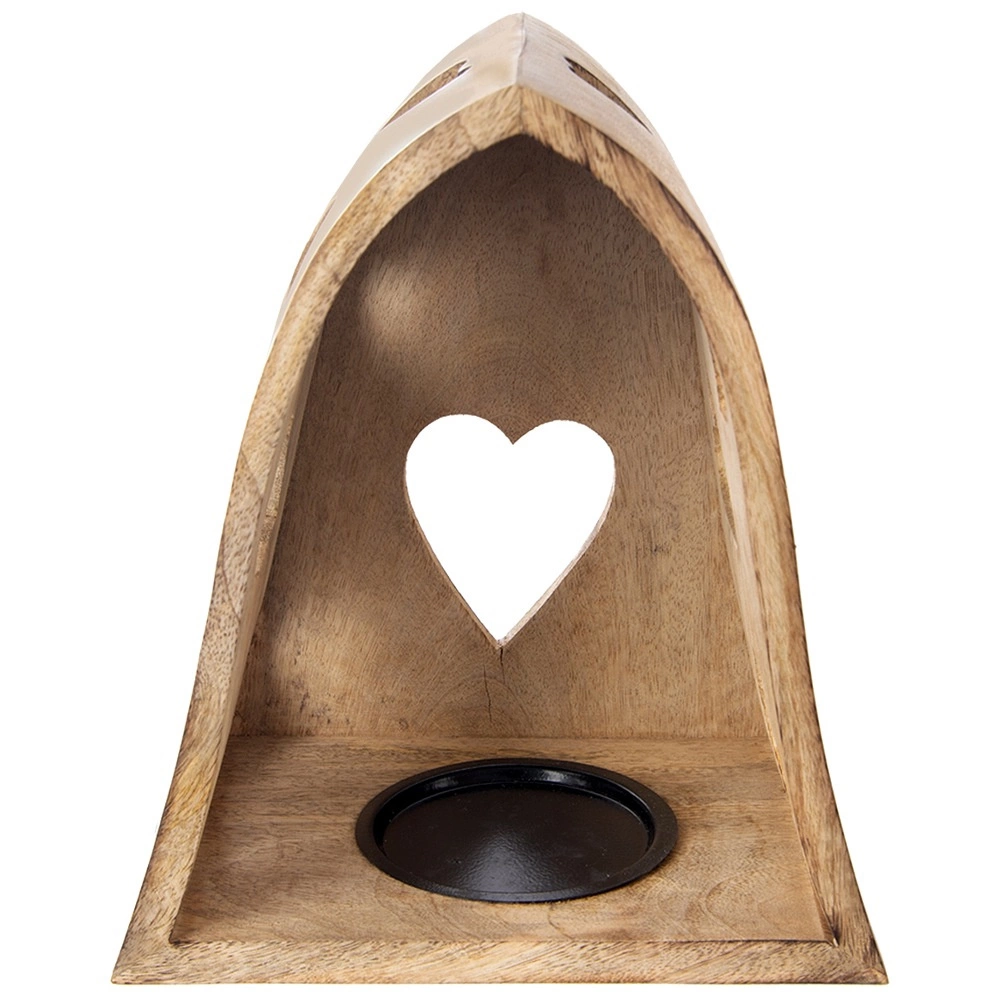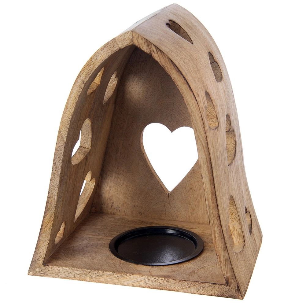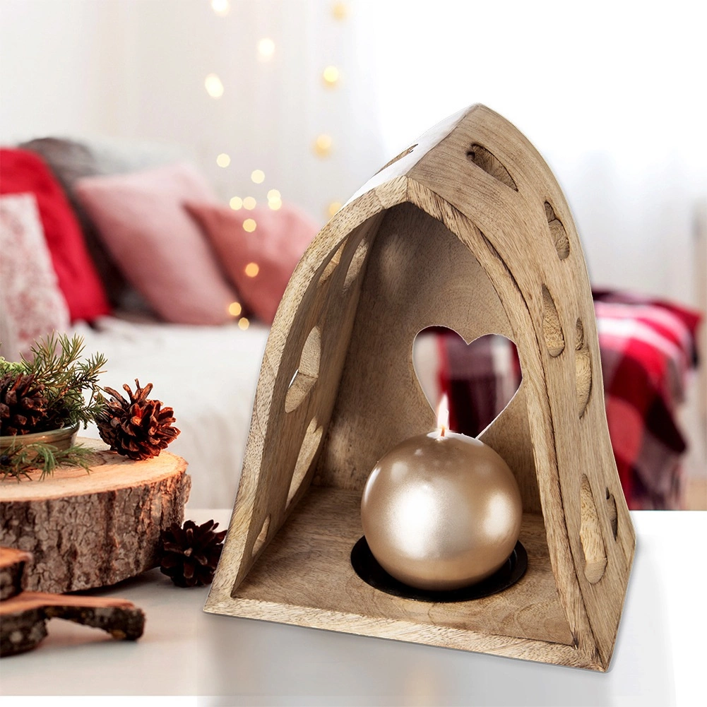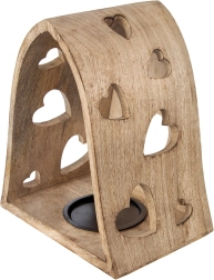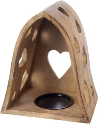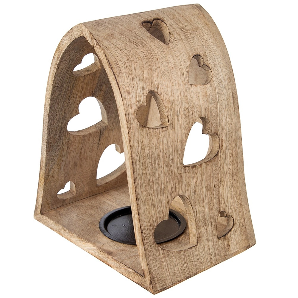 This decorative, arched candle holder combines the natural look of mango wood with delicate heart cutouts that, when illuminated, project cozy light patterns around the space. Ideal for the living room, bedroom, bathroom, or a covered terrace.