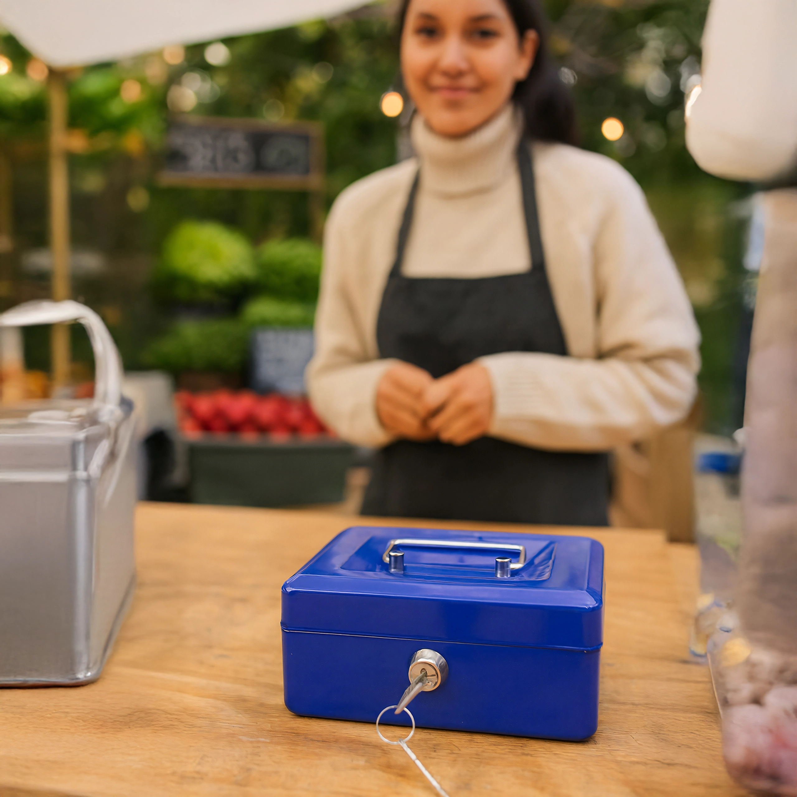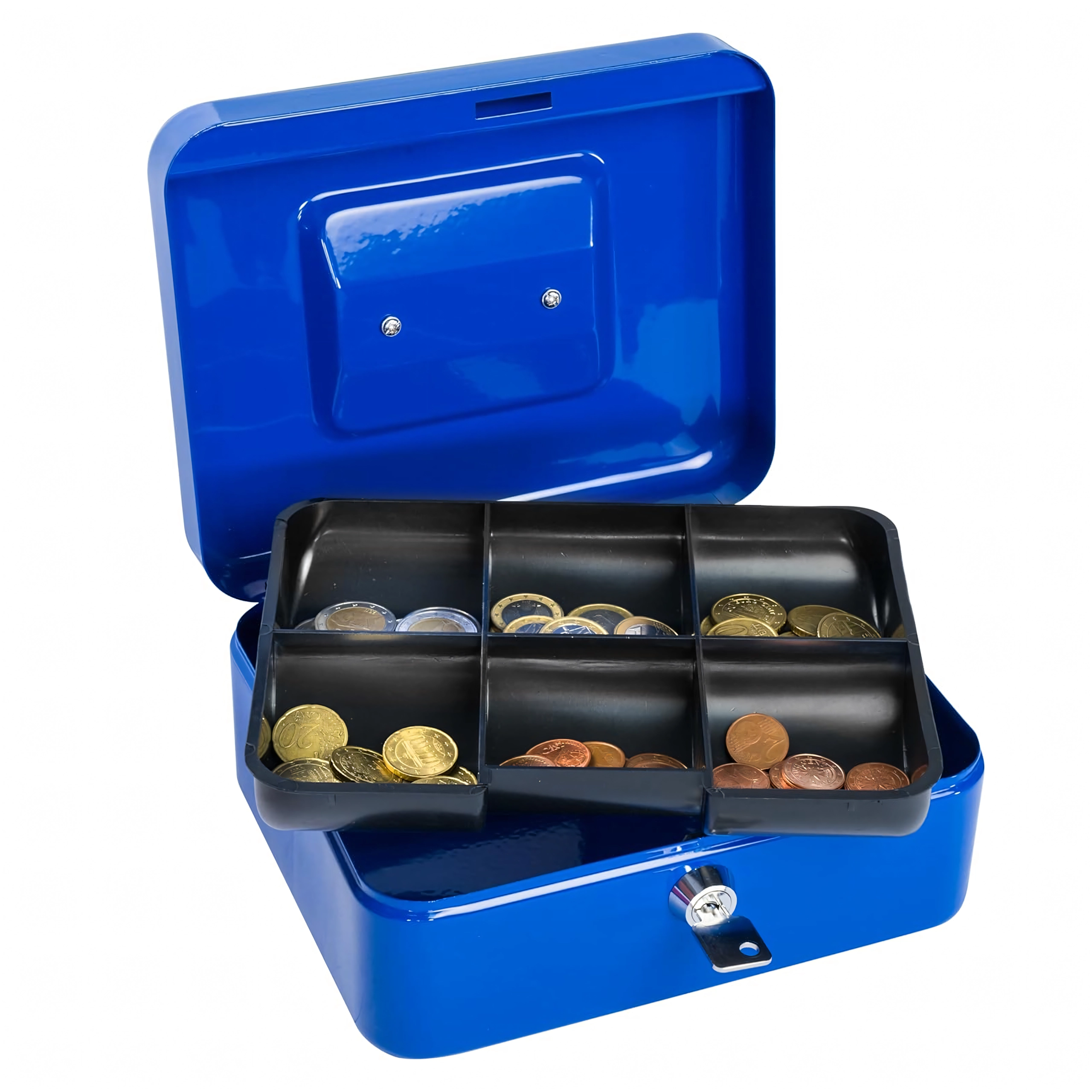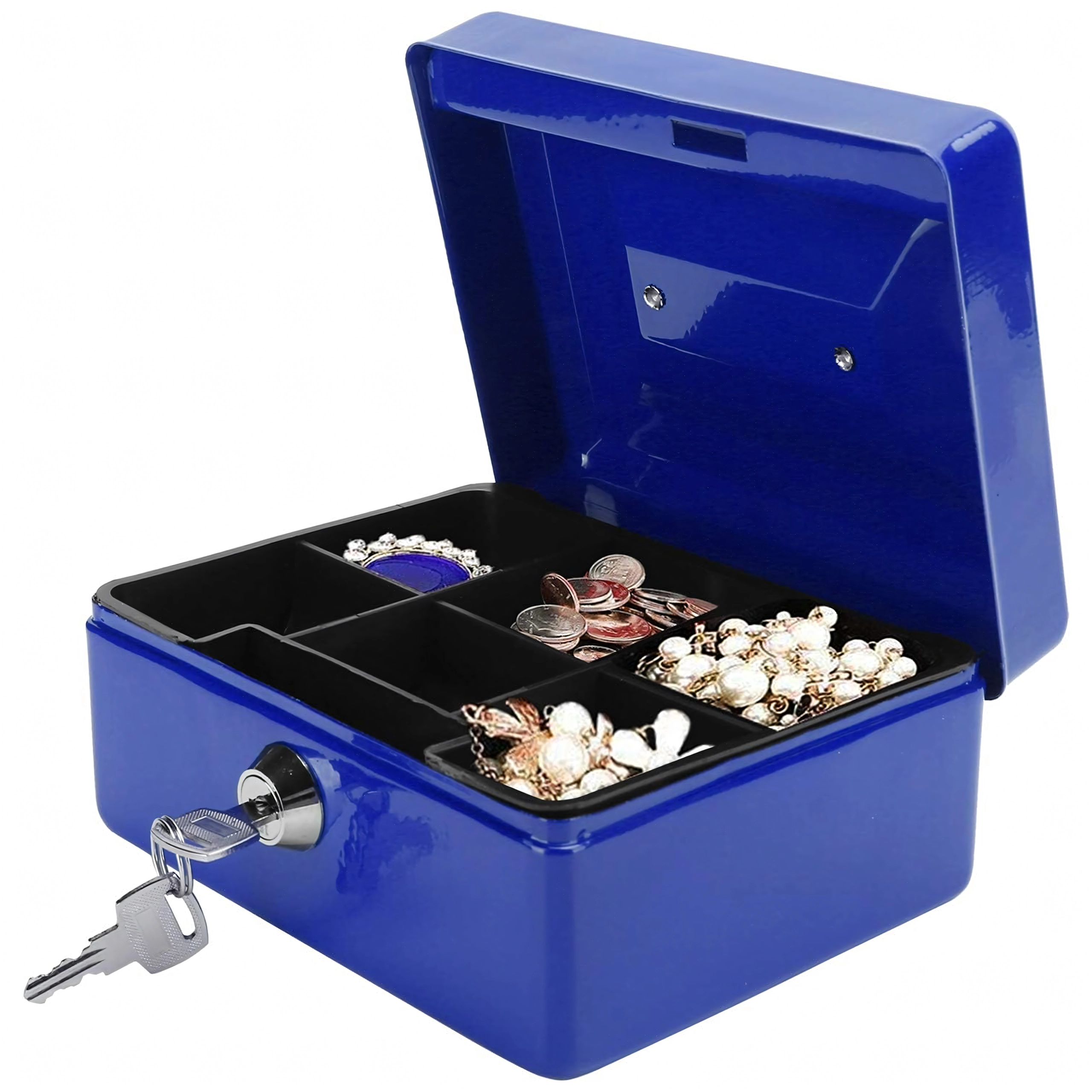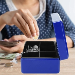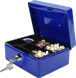 A compact metal cash box with a key lock securely stores your money, jewelry, or documents. Inside is a removable tray with clear coin compartments for quick organization. Thanks to the robust metal construction, practical handle, and reliable lock, it’s ideal for home, office, markets, and stall sales. Durable metal design, a keyed lock, and a coin tray ensure order and security on the go and on site.