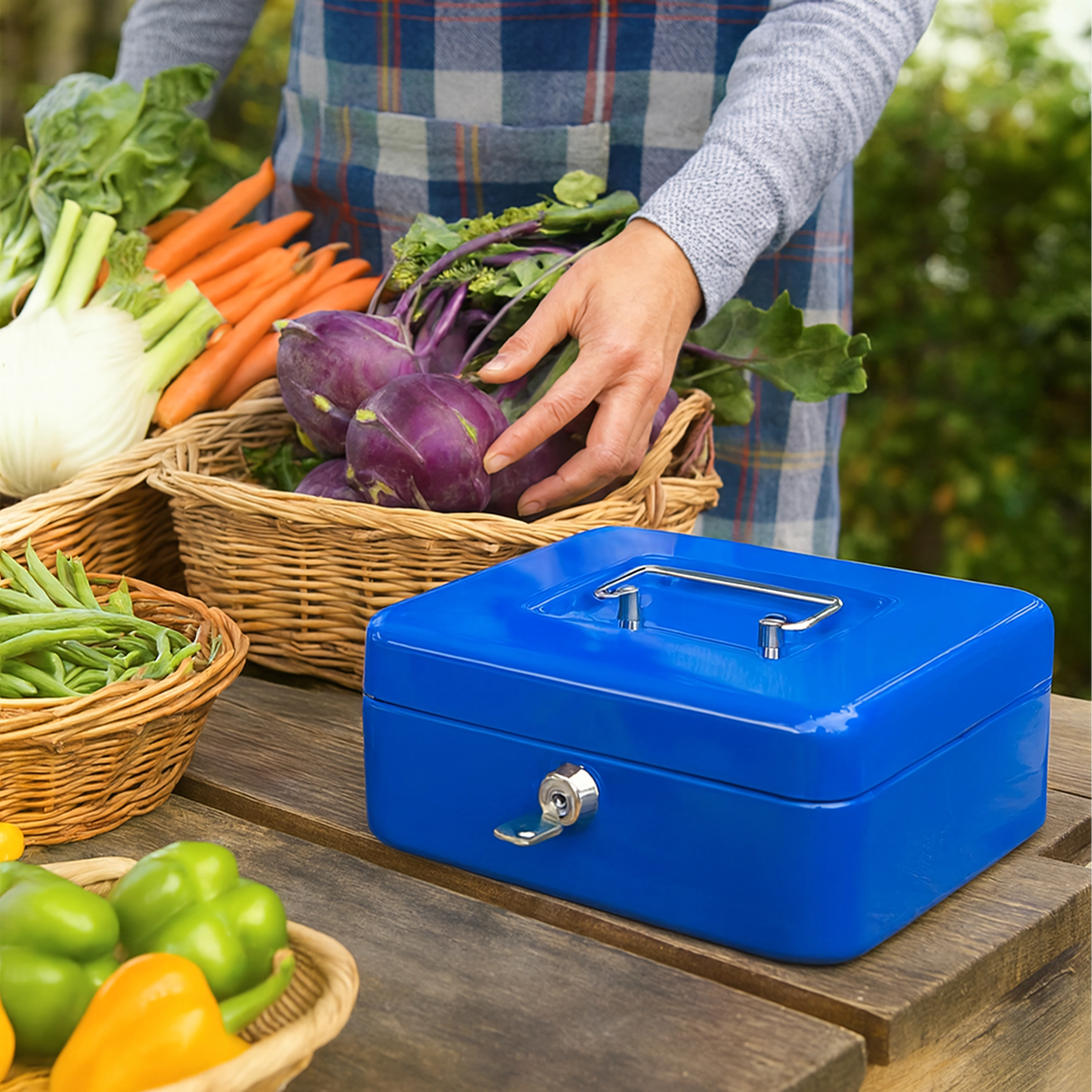 A sturdy metal body and practical handle ensure long service life and comfortable transport at markets, events, or between workplaces.