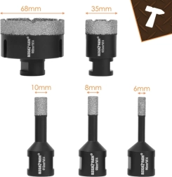 The five most commonly used diameters (6/8/10/35/68 mm) cover installation and tiling work. The included adapter allows use with a drill.