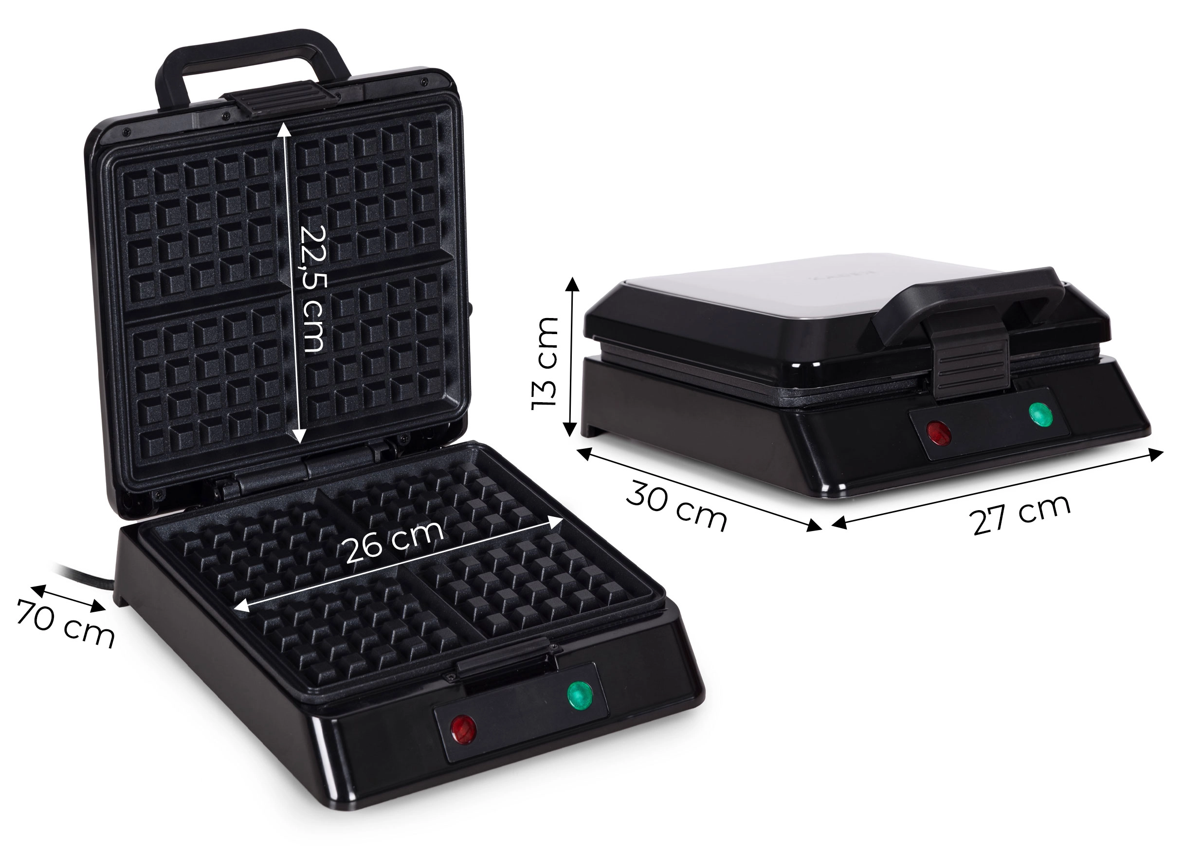 Operation is highly intuitive: indicator lights show heating and readiness, the lid lock keeps the unit securely closed, and the cord storage compartment simplifies putting it away. Thanks to a stable temperature up to 200 °C, you can prepare sweet or savory variations just the way you like.
