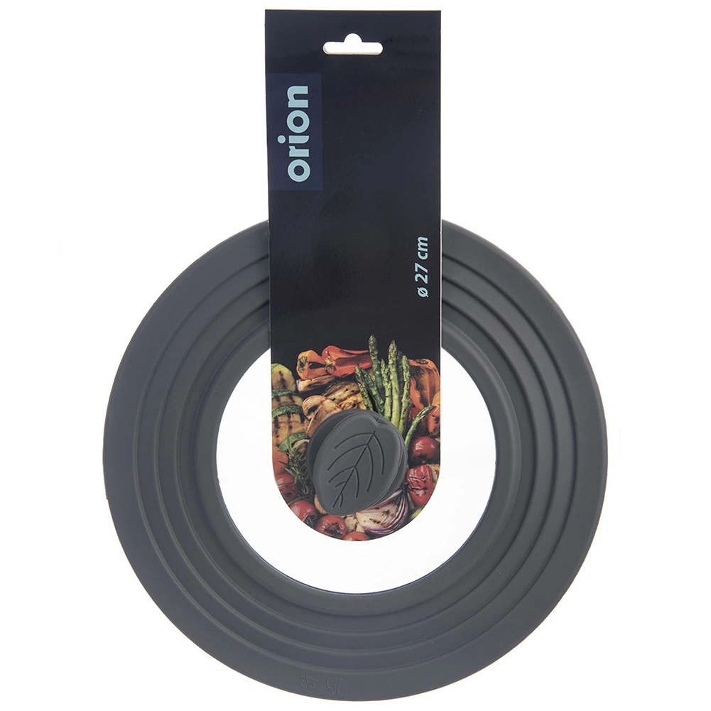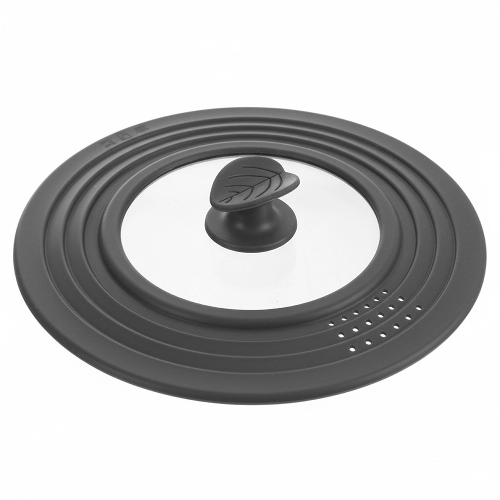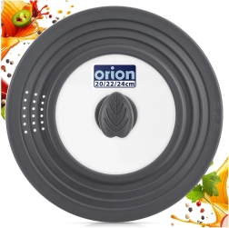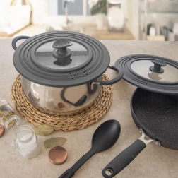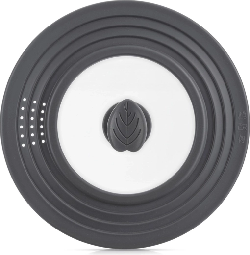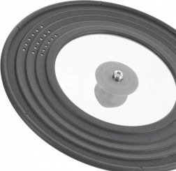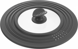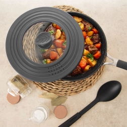 This universal 3-in-1 lid replaces three separate lids, saving space in your kitchen. Thanks to the durable glass and grey silicone rim, it adheres perfectly to the edges of pots and pans, protects them from damage, and ensures a tight seal. The transparent glass allows monitoring of cooking without lifting.