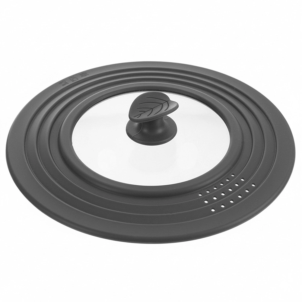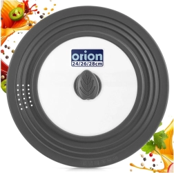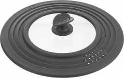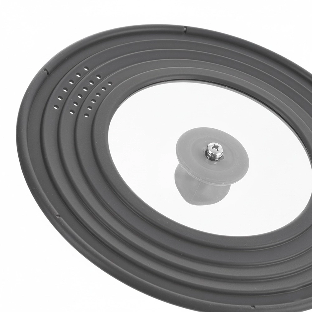 This universal lid made of tempered glass and durable silicone in gray replaces three separate lids. Thanks to the stepped silicone rim, it fits cookware with a diameter of 24, 26, and 28 cm and protects the edges of pots and pans from damage. The transparent glass lets you monitor cooking without lifting.