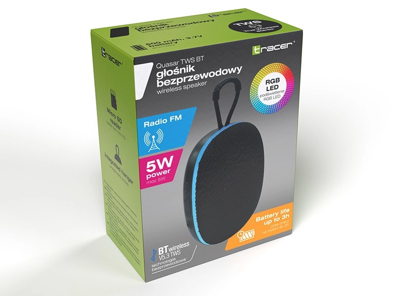 Take the compact, lightweight TRACER Quasar TWS BT speaker anywhere. It offers Bluetooth 5.3 for a stable connection, TWS pairing of two units for stereo, 5 W output, up to 3 hours of playback from a 500 mAh battery, built-in FM radio, and playback from microSD/USB—all in a durable body with a practical strap.