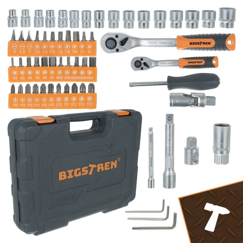 Universal BIGSTREN 72-piece tool set in a durable case for workshop, home, and car. Includes 1/4" and 1/2" ratchets with fine 72T mechanism, a wide range of sockets, bits, and extensions made from CrV alloy for long service life. The practical case ensures order, clarity, and easy transport.