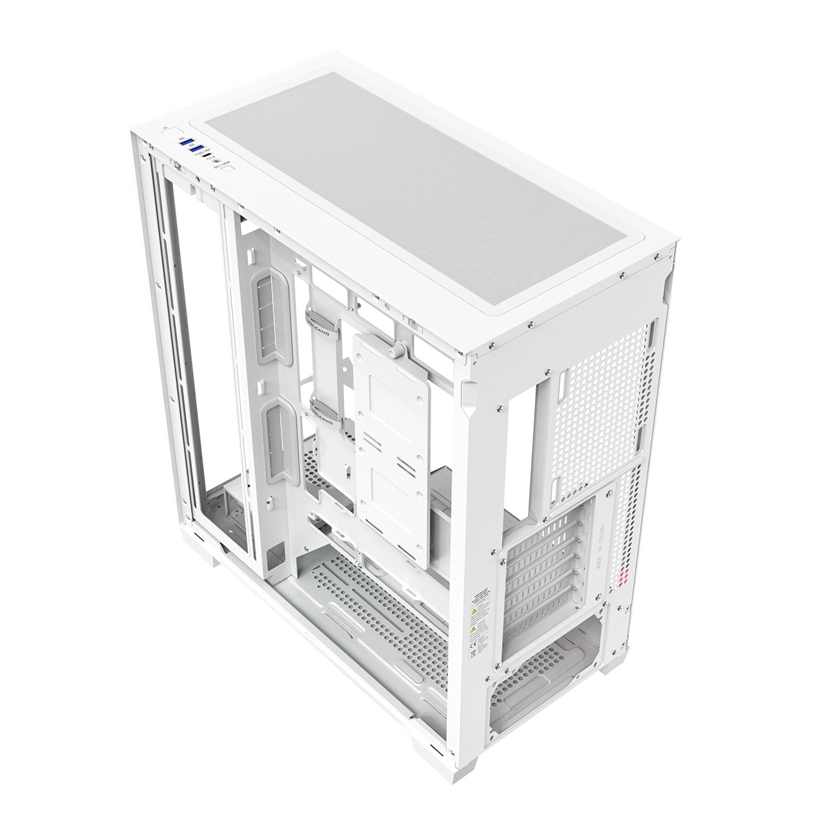 Tool‑free snap‑on side panels, hook‑and‑loop cable organizers, and rubber grommets. More space behind the motherboard tray for simple cable routing and better airflow.