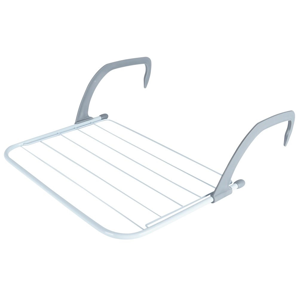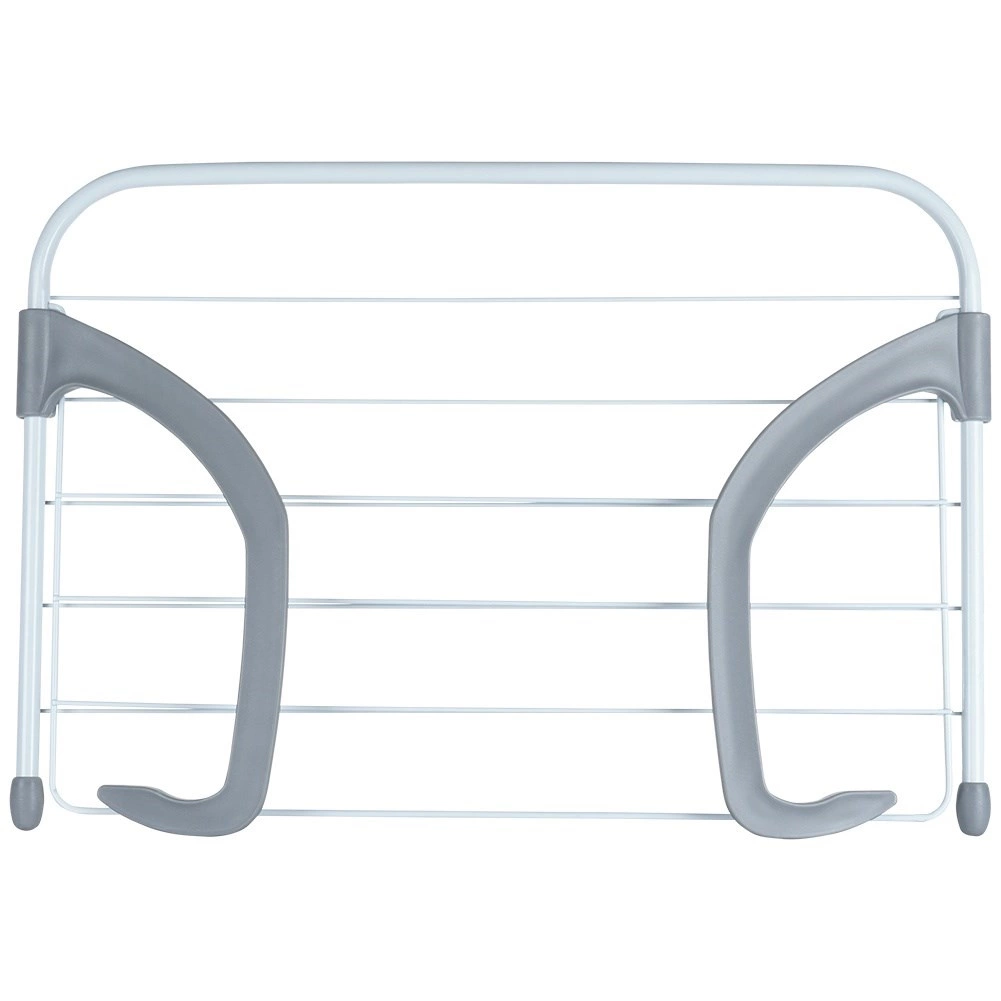 Installation is quick and tool-free—simply hang it using the sturdy plastic hooks. After use, fold the rack flat and store it easily in a cabinet or drawer. The durable white metal frame with grey grips ensures stability and long life.