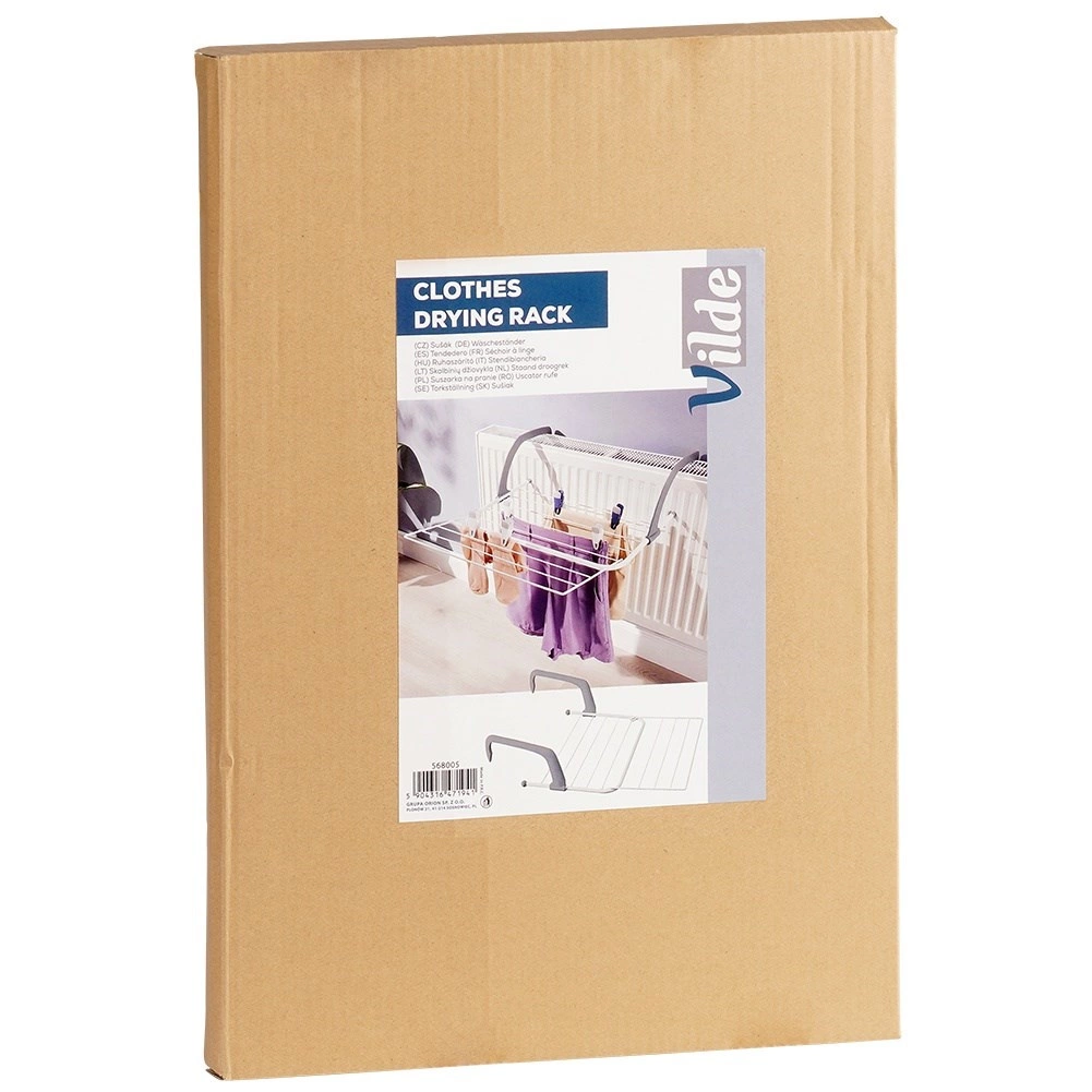 This practical expandable radiator drying rack in white offers space saving, fast drying thanks to radiator heat, and easy tool-free installation. With its adjustable hooks, it hangs on most radiators and railings, and the compact design with a durable metal build ensures long service life.